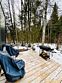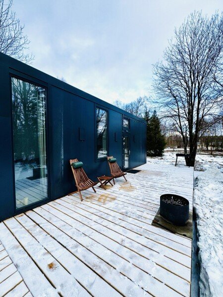 Большая двуспальная кровать 180/200, просторная кухня-столовая, гостиная с диваном, трансформирующимся в 2-х спальные места, санузел, теплый пол, открытая терраса с панорамным видом на лес, с которой можно кормить оленей и кроликов. В доме реализована финская концепция панорамного остекления — из любой части дома через окно виден лес. Перед домом костровая чаша и мангальная зона.