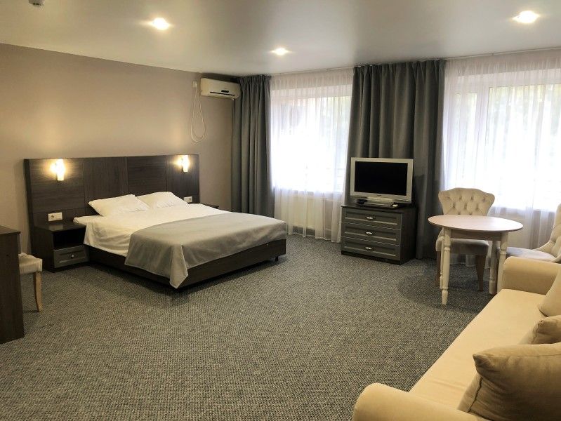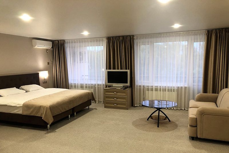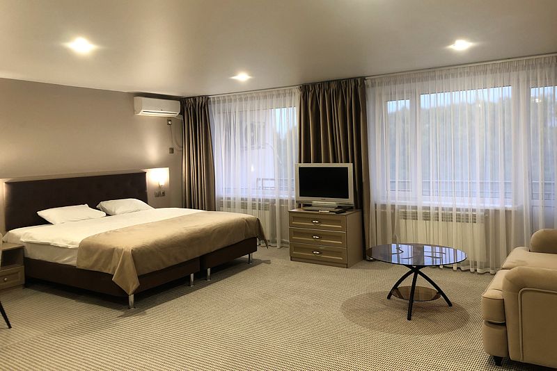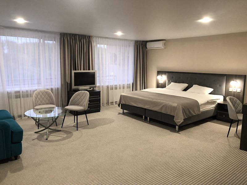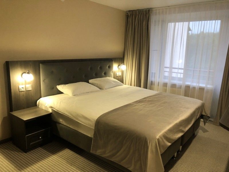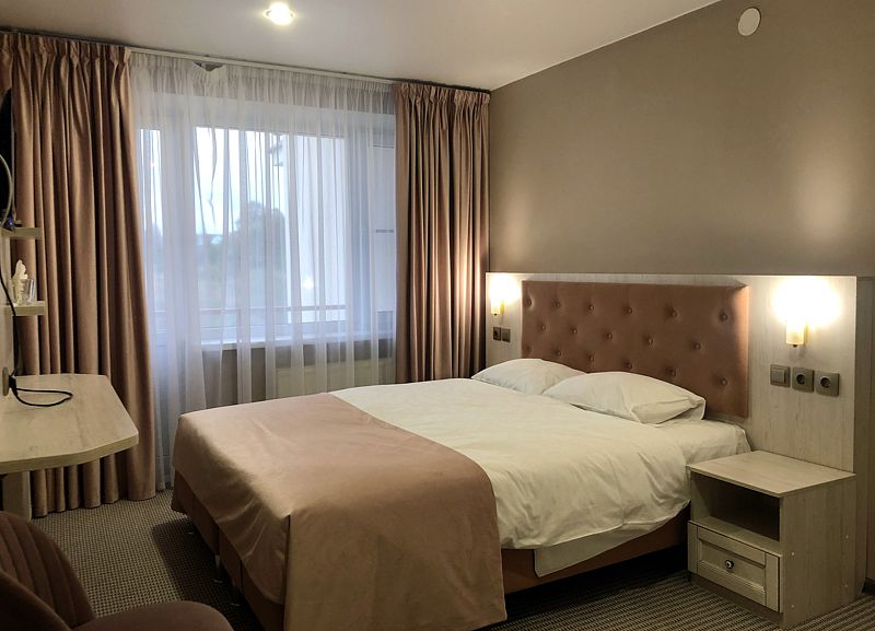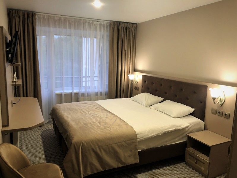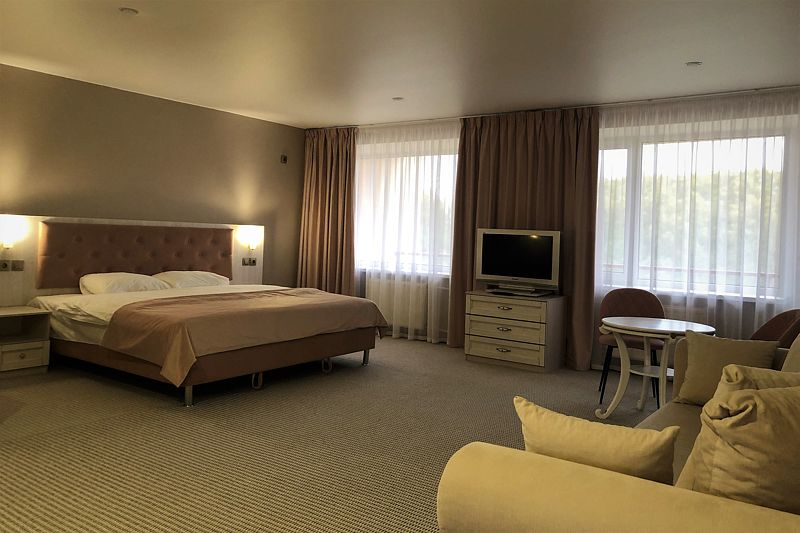 Гостиничный комплекс разместился на благоустроенной территории среди хвойного леса и состоит из главного пятиэтажного жилого корпуса, спортивного корпуса и молодежного центра, включающего в себя пять жилых зданий. В целом, обширный номерной фонд отеля единовременно готов принять до 900 человек. Гостей ожидают комфортабельные двухместные номера категории Стандарт, Люкс и Комфорт, оснащенные новой мебелью, современной техникой, санузлом с душем и косметическими принадлежностями.