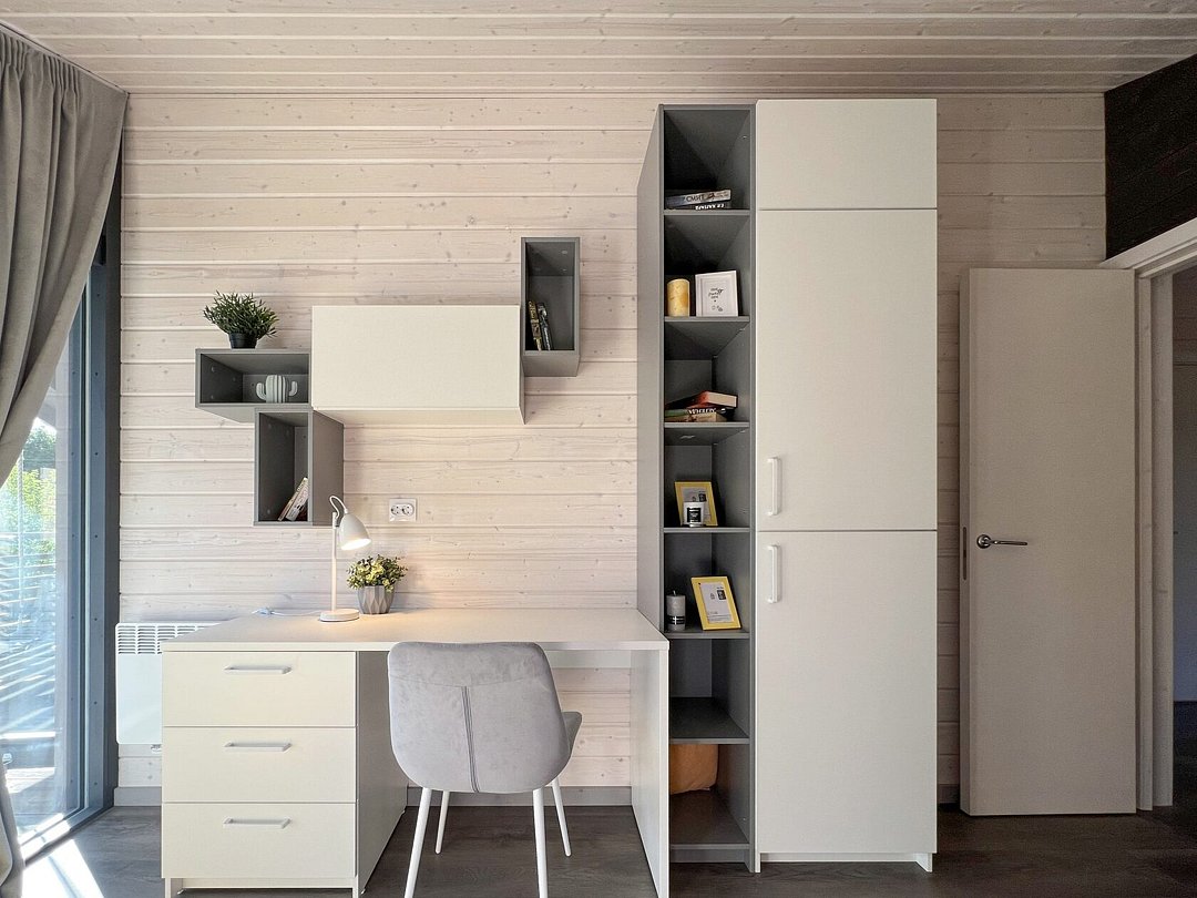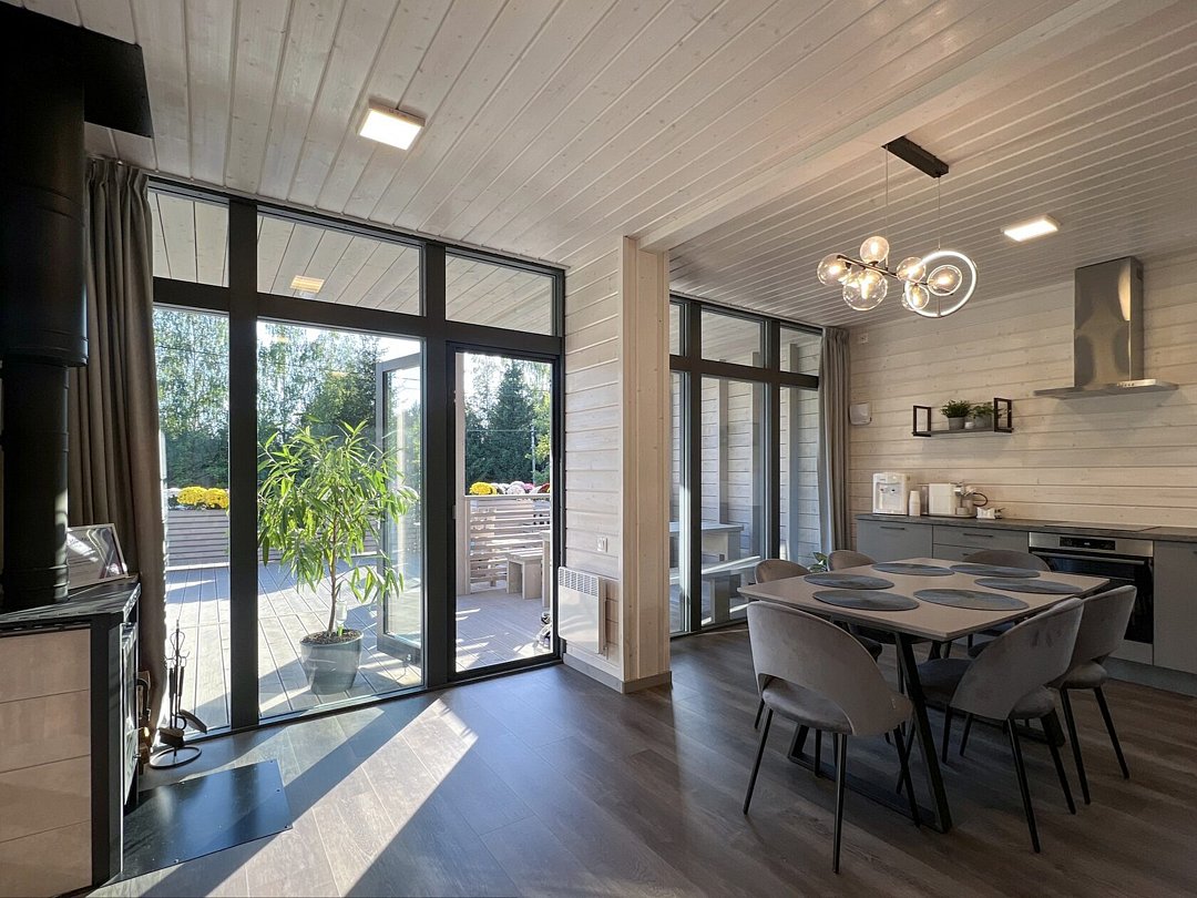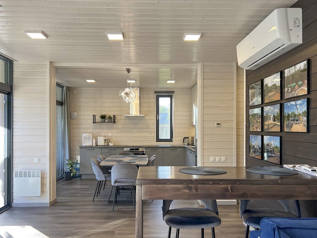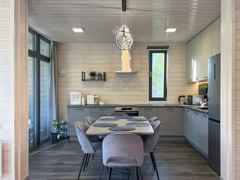 Просторные комнаты создают атмосферу гостеприимства и уюта. Кухня-гостиная — идеальное место для отдыха у камина или совместного приема пищи с видом на живописный пейзаж. Ванные комнаты оснащены всем необходимым, а удобная мебель гарантирует максимальный комфорт. На кухне имеется полный комплект посуды и бытовой техники, что позволяет готовить вкусные блюда и наслаждаться ими в кругу близких.
