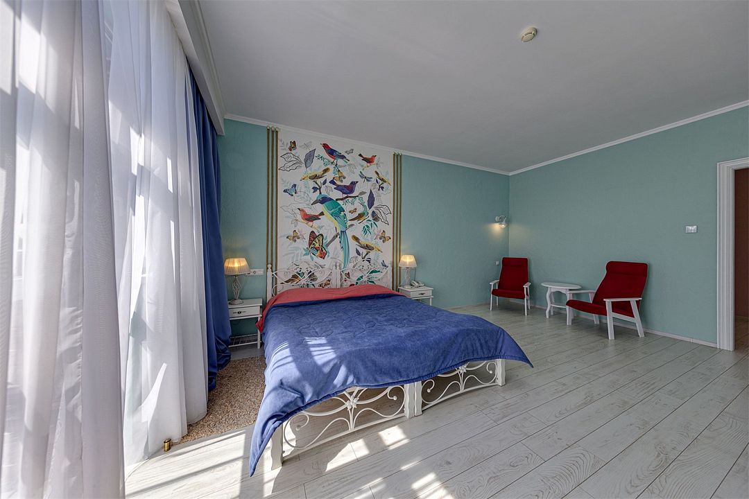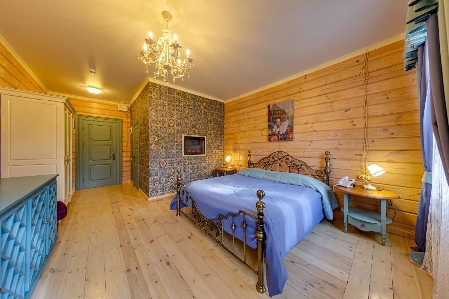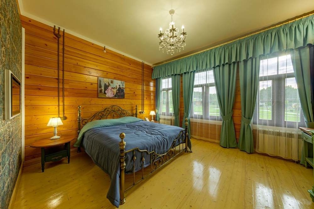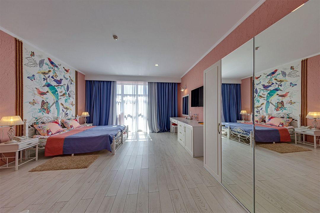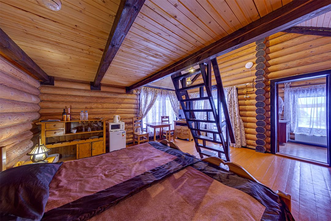 Номер оснащен двумя кроватями, совмещенными в одну большую кровать с удобным ортопедическим матрасом. Из больших панорамных окон открывается прекрасный вид на реку или на живописную территорию отеля.