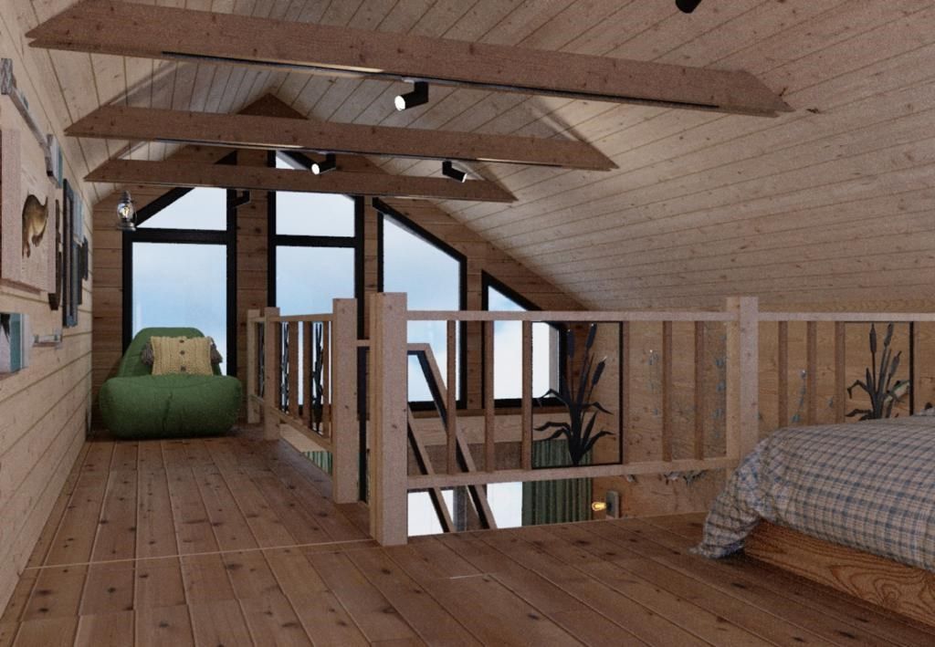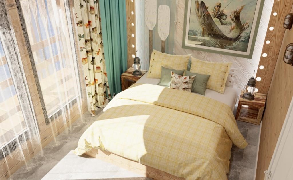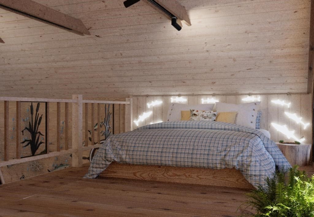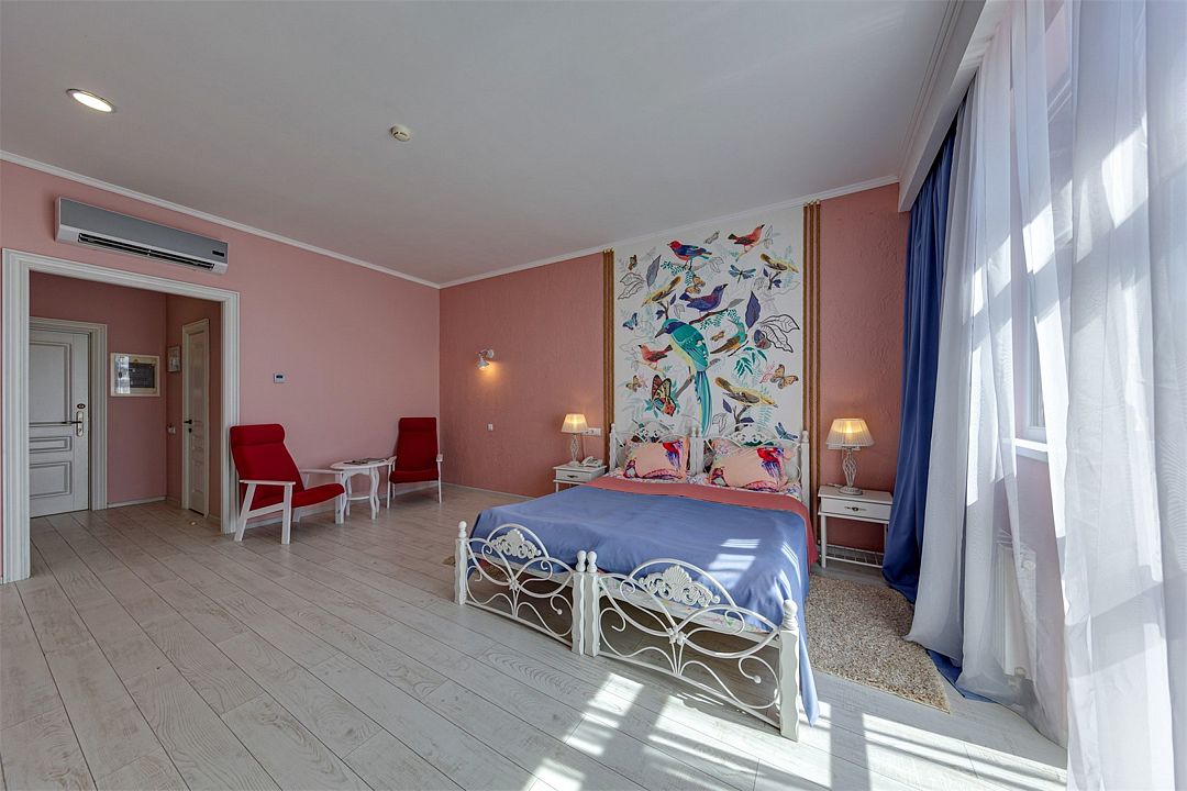 Номер оснащен двумя кроватями, совмещенными в одну большую кровать с удобным ортопедическим матрасом. Из больших панорамных окон открывается прекрасный вид на реку или на живописную территорию отеля.