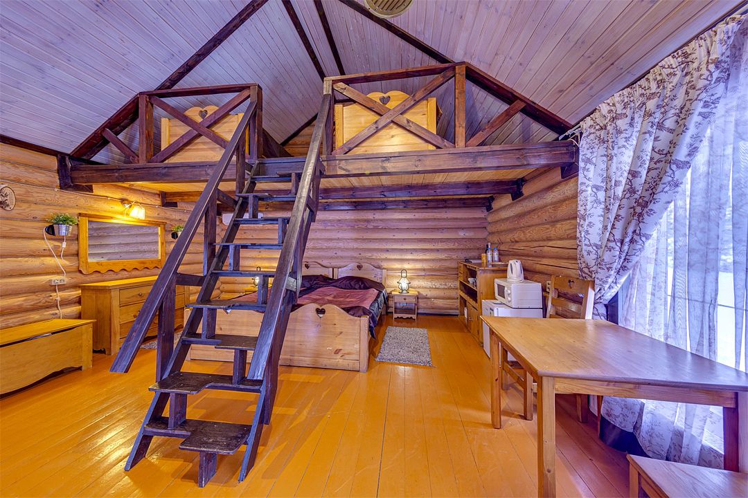 Первый этаж – просторная меблированная гостиная, идеально подходящий для различного вида мероприятий: от тематических вечеринок и банкетов. Оснащена кухней с холодильником и микроволновой печью, и зоной отдыха с плазменной панелью. На первом этаже расположены 6 номеров категории делюкс.