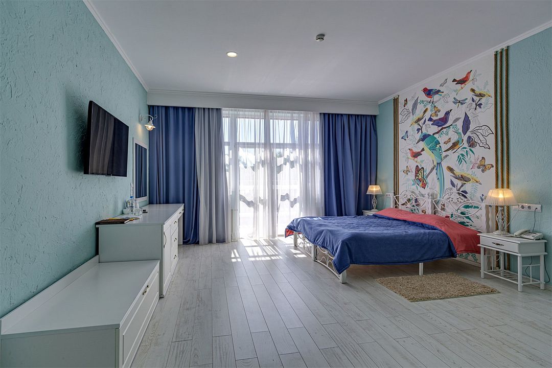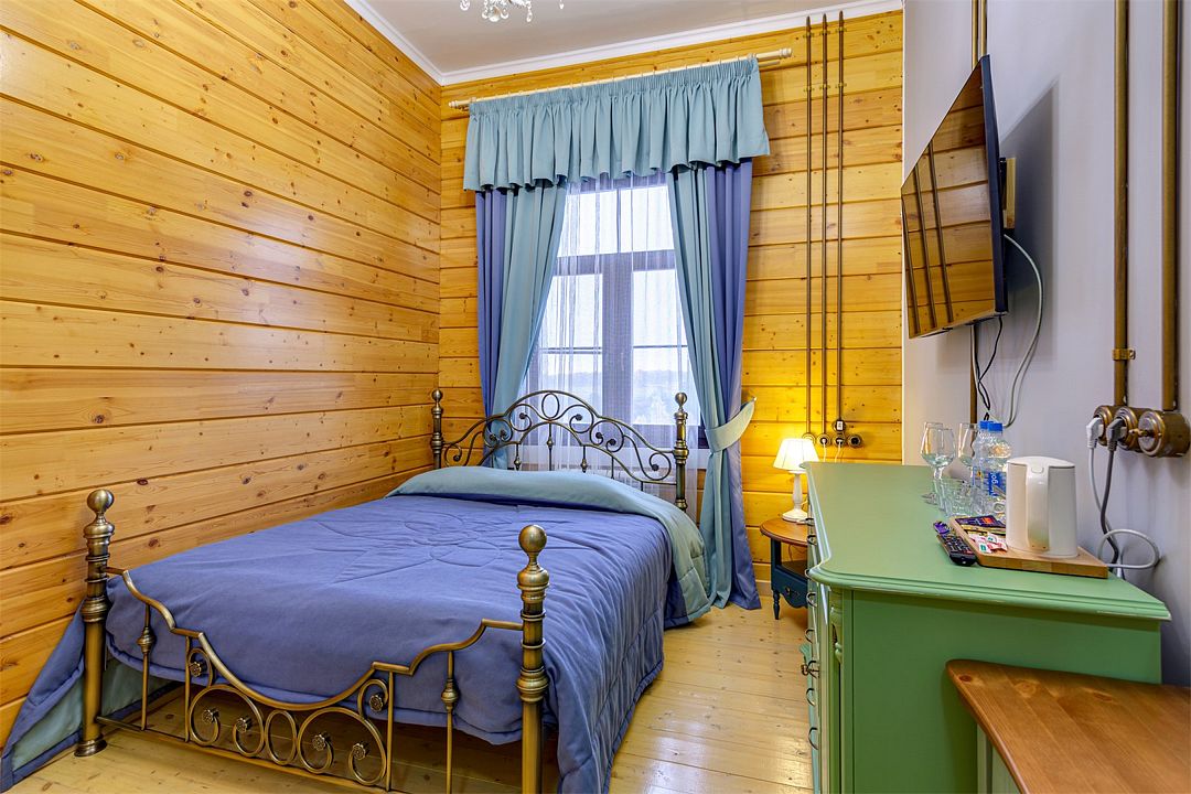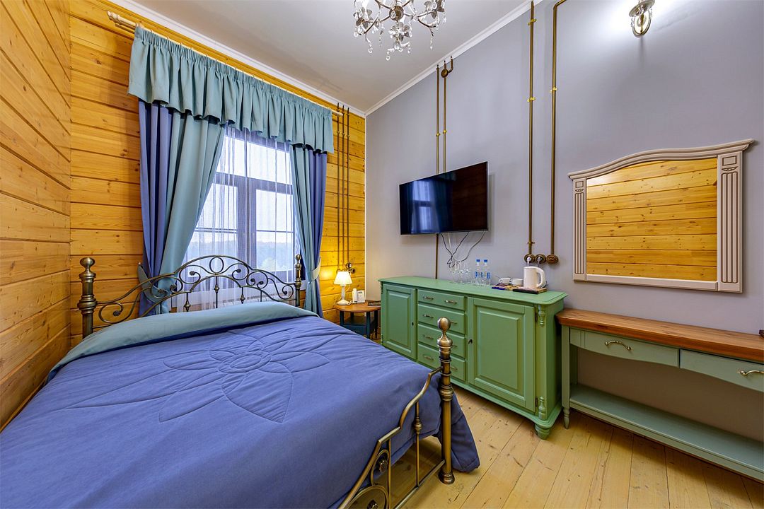 Номер оснащен двумя кроватями, соединенными в одну большую кровать с удобным ортопедическим матрасом. Из больших панорамных окон открывается прекрасный вид на реку или на живописную территорию отеля.