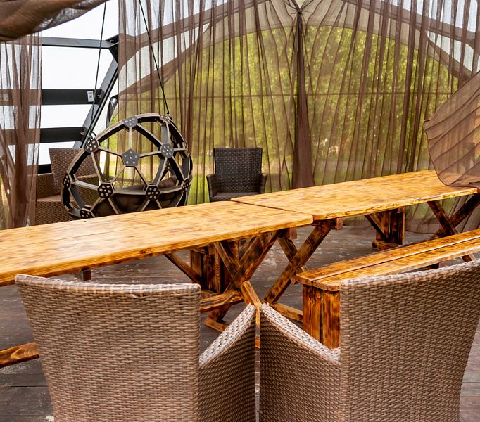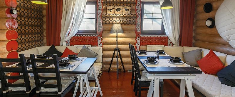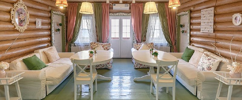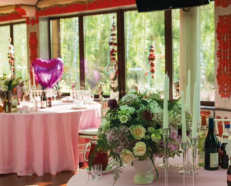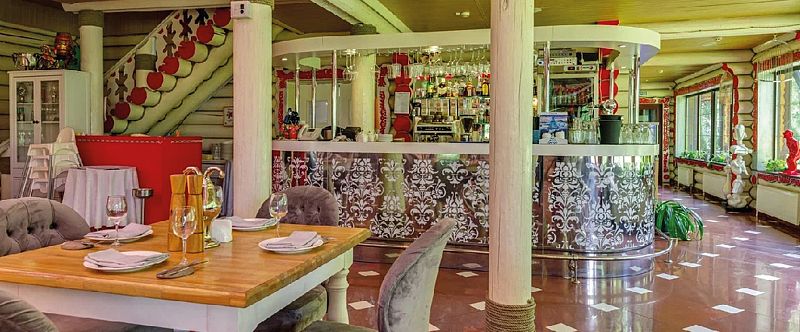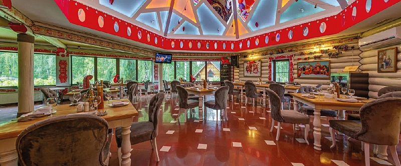 Читать полностьюБанкетный зал «ПетRUшка» в парк-отеле «Орловский» сочетает в своем интерьере богатый русский стиль и современные элементы. Гостей ждет атмосфера купеческого дома Российской империи с деревянными интерьерами, массивной мебелью, бархатом и народными фольклорными мотивами. Интерьер дополняют оригинальные куклы, а панорамные окна открывают вид на живописную березовую рощу.