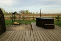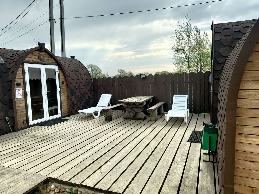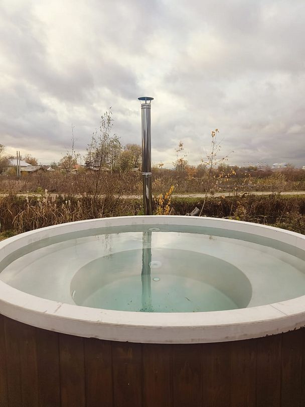 Между Бунгало и Баней установлена купель, которая отапливается с помощью дровяной печи, а также 2 шезлонга.