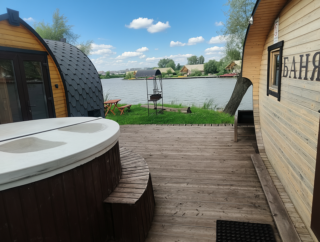 Бунгало на берегу реки с баней и купелью — идеальный отдых с комфортом.