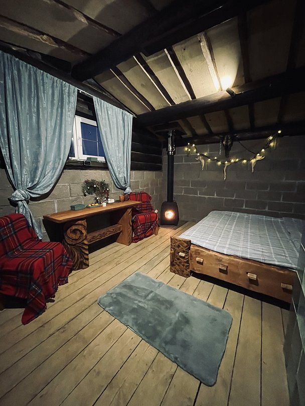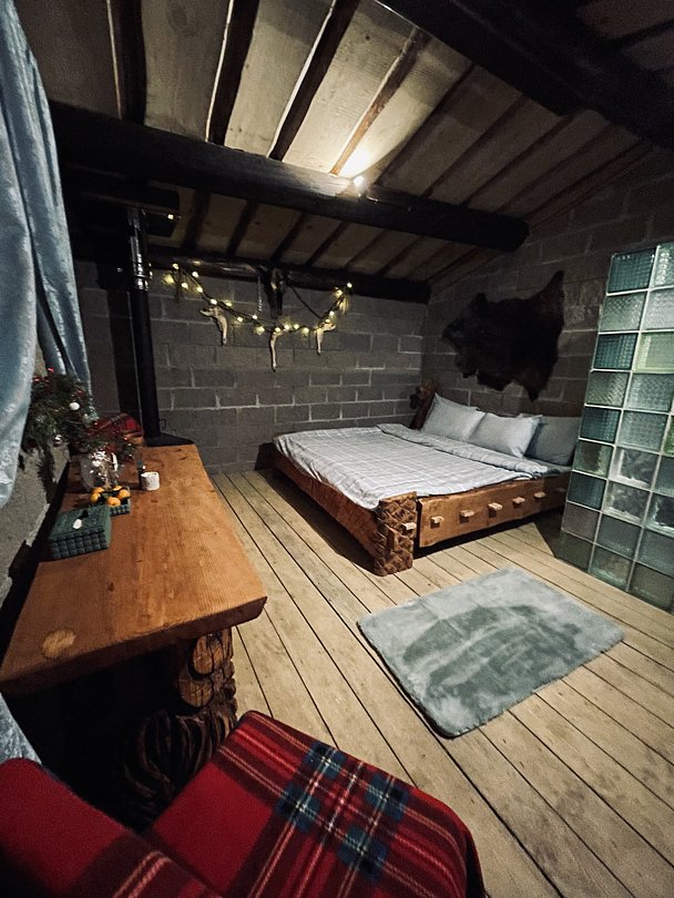 Уникальный домик-землянка для ценителей необычного отдыха. Интерьер сочетает аутентичность с современным комфортом.