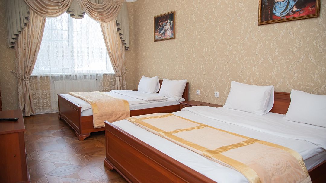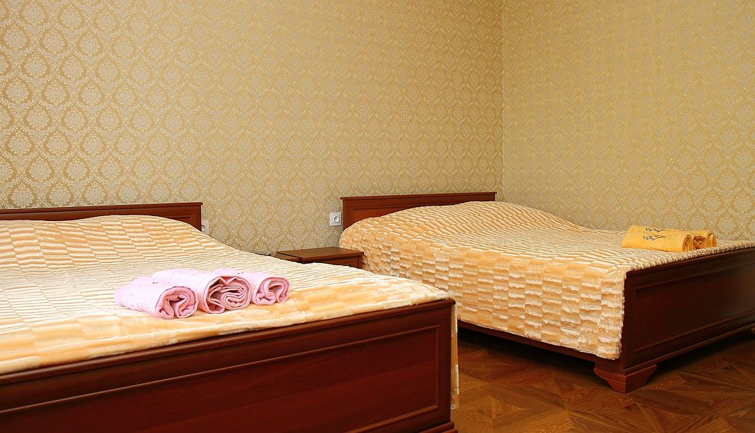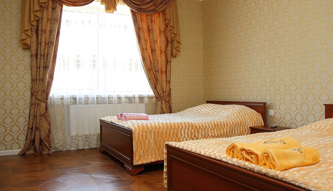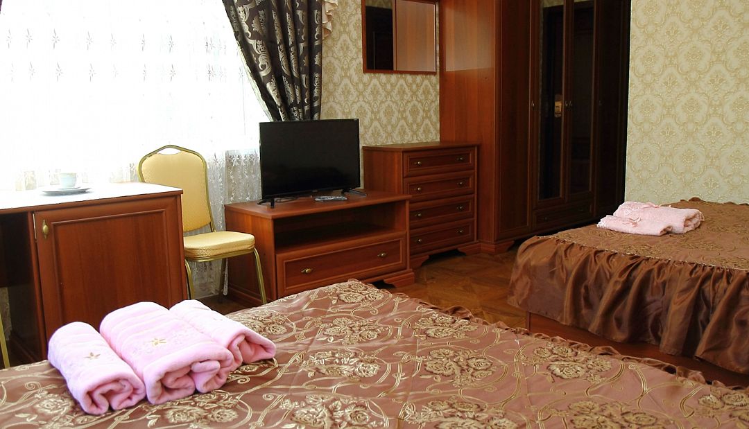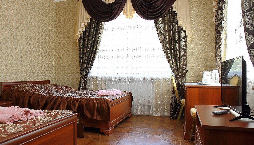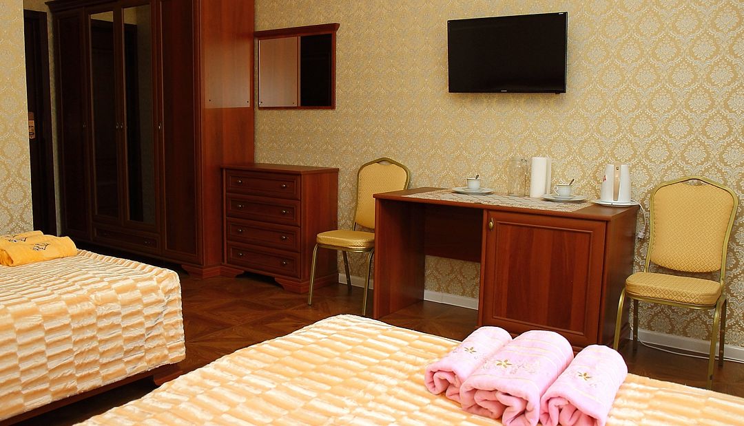 Однокомнатный номер с двумя двухспальными кроватями исполненный в классическом стиле.