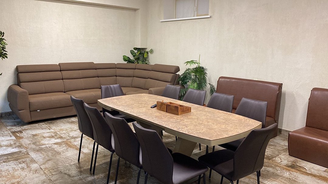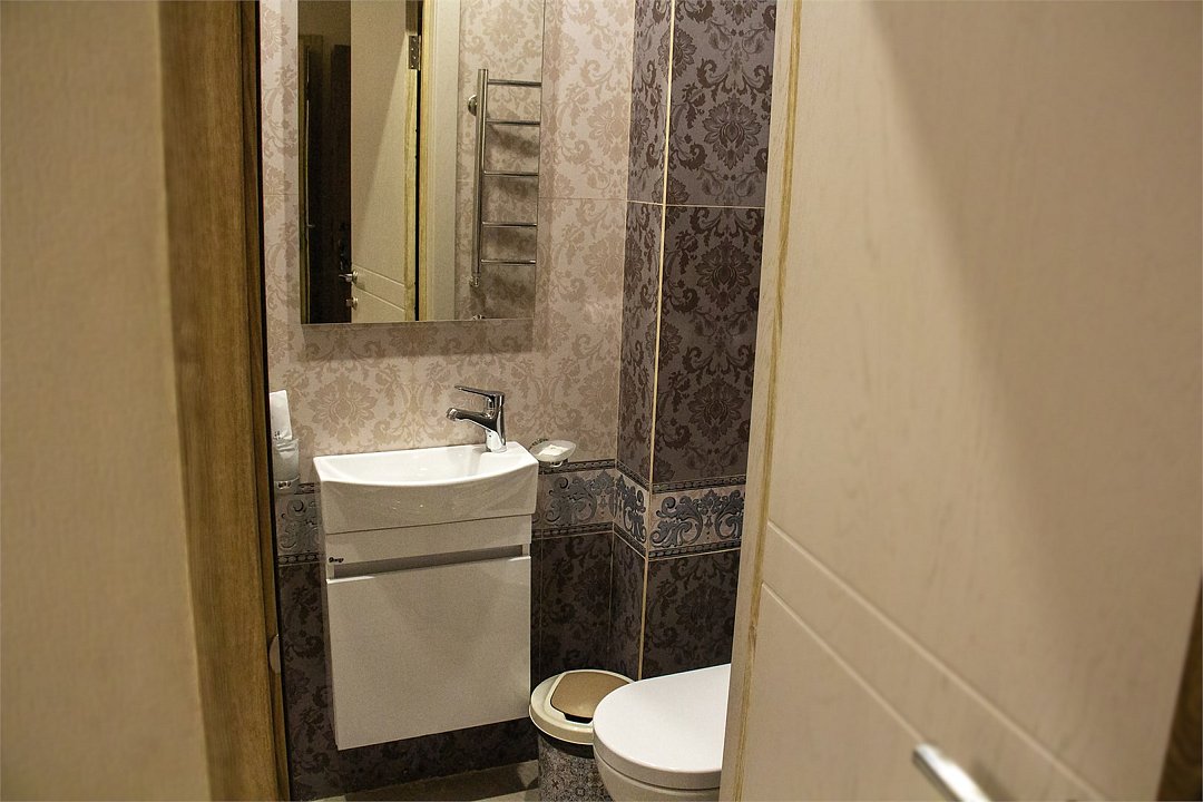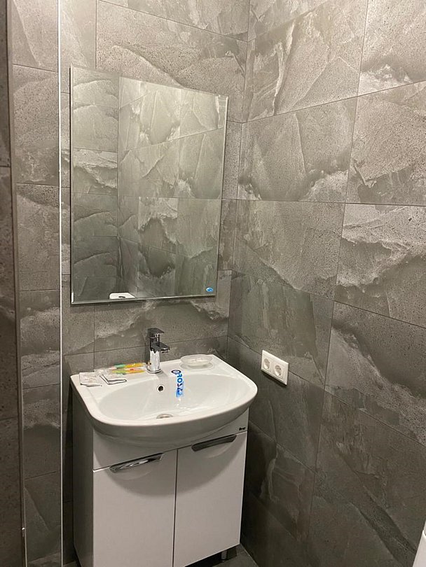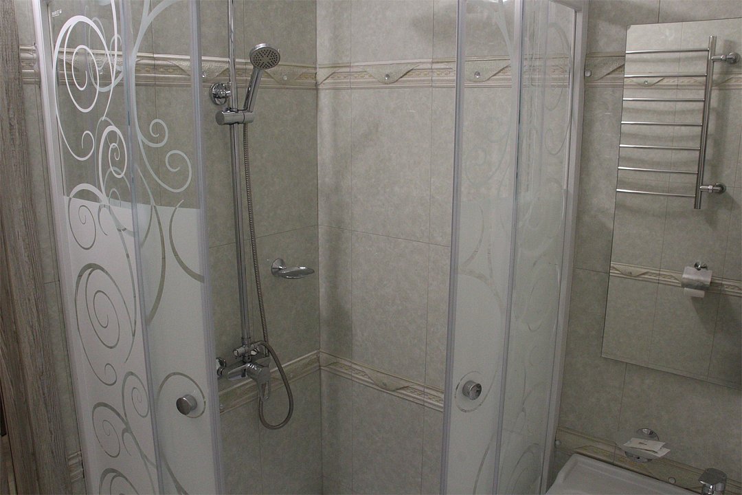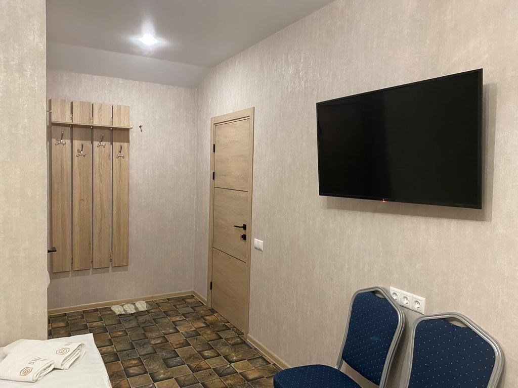 Просторный номер находится в цокольном этаже. Рядом расположены комната отдыха ( диван, стол, телевизор), две ванных комнаты (душевая кабина, раковина), два санузла ( унитаз, раковина)Услуги и удобства