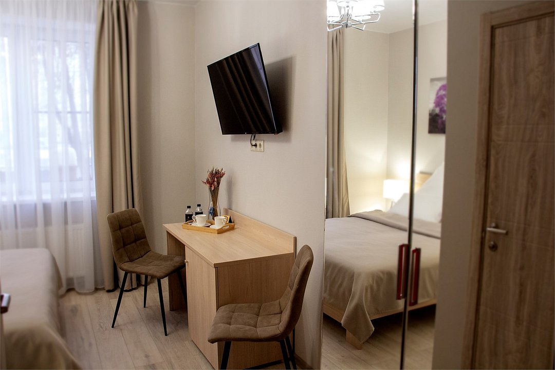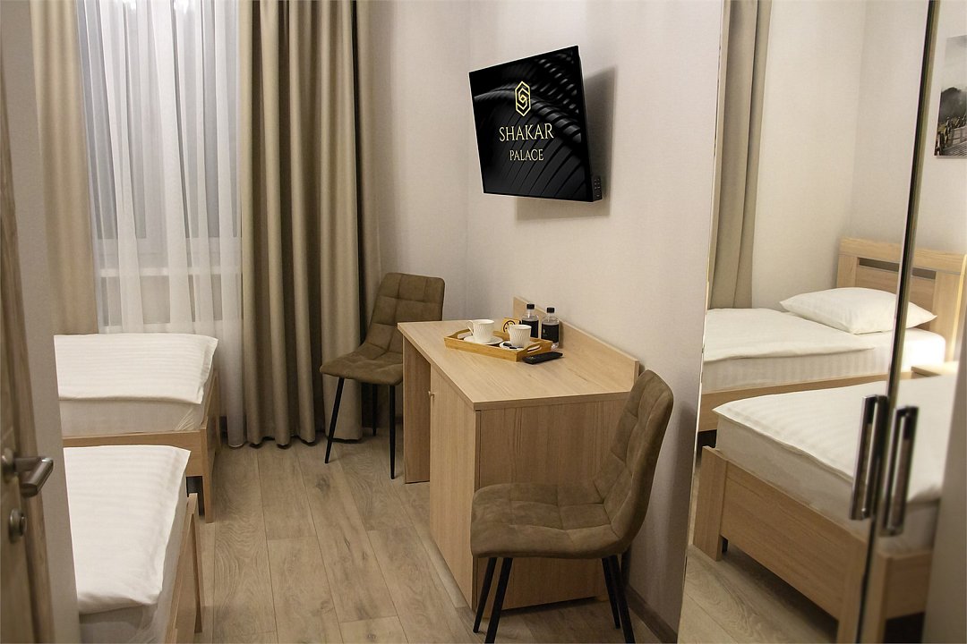 Wi-Fi, настольные лампы, фен, душевая кабина, банные полотенца, гигиенические средства, две односпальные кровати, ортопедический матрас, тумбы, стулья, шкаф для одежды, вешалки, письменный стол, унитаз, раковина, вид на город, вид во двор, телевизор с плоским экраном, без окна, телевизор со Smart TVВ гостиничном номере