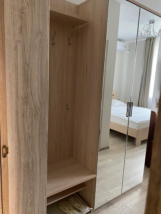 Wi-Fi, настольные лампы, фен, душевая кабина, халаты, гигиенические средства, балкон, двуспальная кровать, диван, тумбы, стулья, шкаф для одежды, вешалки, письменный стол, чайный набор, чайник, унитаз, раковина, питьевая вода, душ, ламинат, стаканы, москитная сетка, телевизор со Smart TVВ гостиничном номере