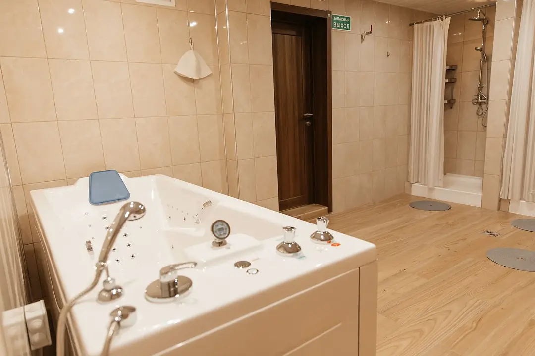 Инфраструктура: бассейн, купель, зона отдыха, душНа первом этаже расположены: две комнаты отдыха, парная, купель, душевая кабина, крытый бассейн с подогревом (бассейн 6х12 м). На втором этаже расположены: комната отдыха, комната массажа. Вместимость: до 6 человек. Длительность сеанса: 2 часа.