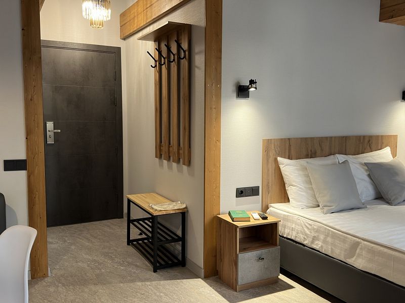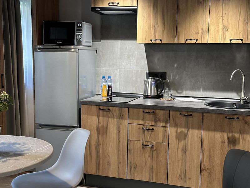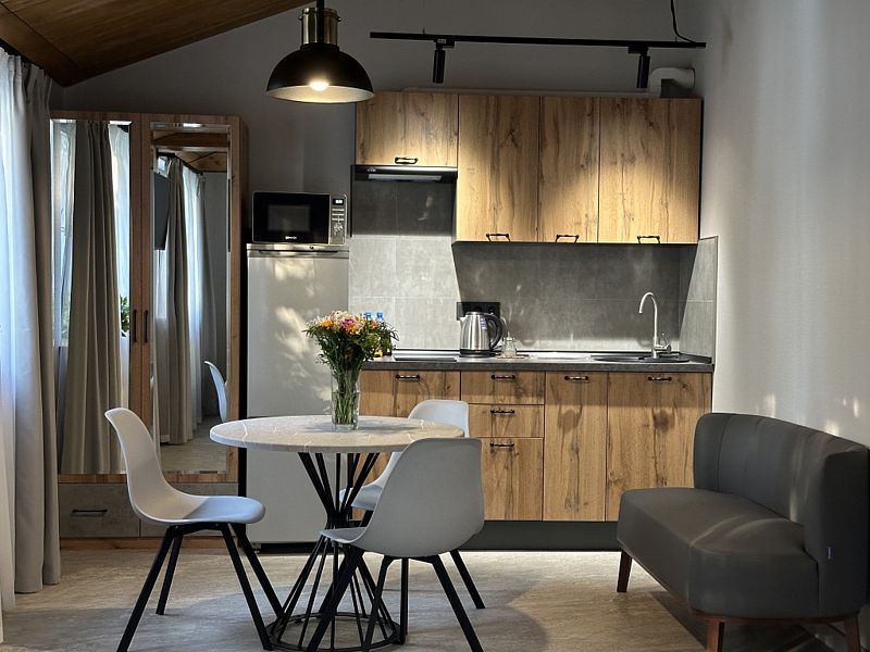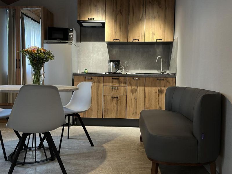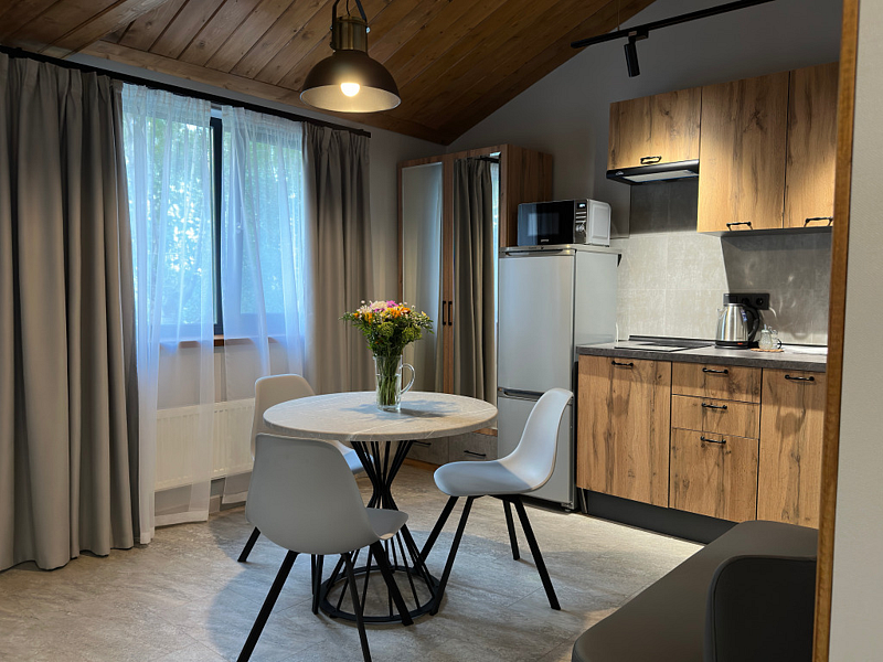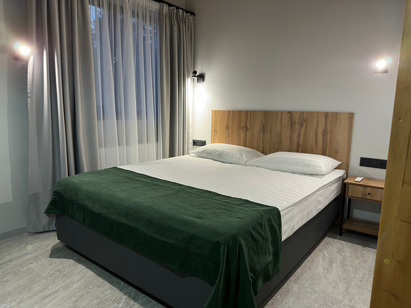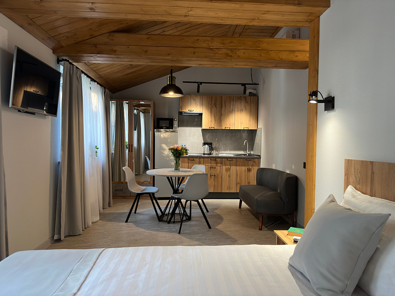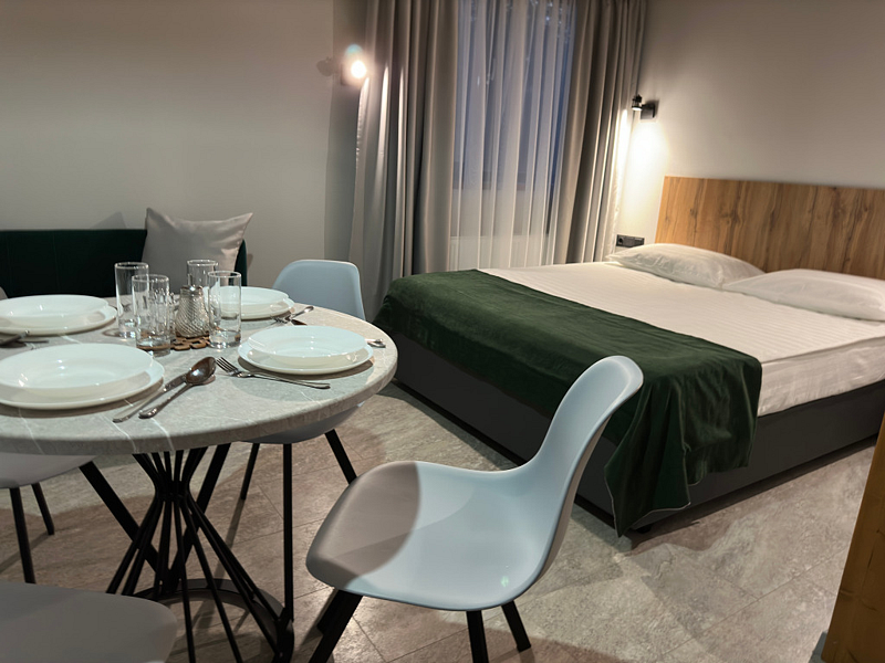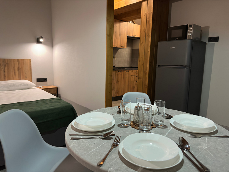 Двухместные апартаменты-студия с кухней, обеденной зоной, с видом на озеро. Есть вся необходимая мебель для проживания 2 гостей: - двуспальная кровать; - места для хранения вещей и обеденная зона; - кухонный уголок со всей необходимой посудой для приготовления и приема пищи; - необходимая бытовая техника и приборы: телевизор, холодильник, фен, утюг, стиральная машина, микроволновая печь; - Wi-Fi, Smart TV; - полотенца, качественное постельное белье из 100% хлопка (сатин).