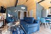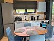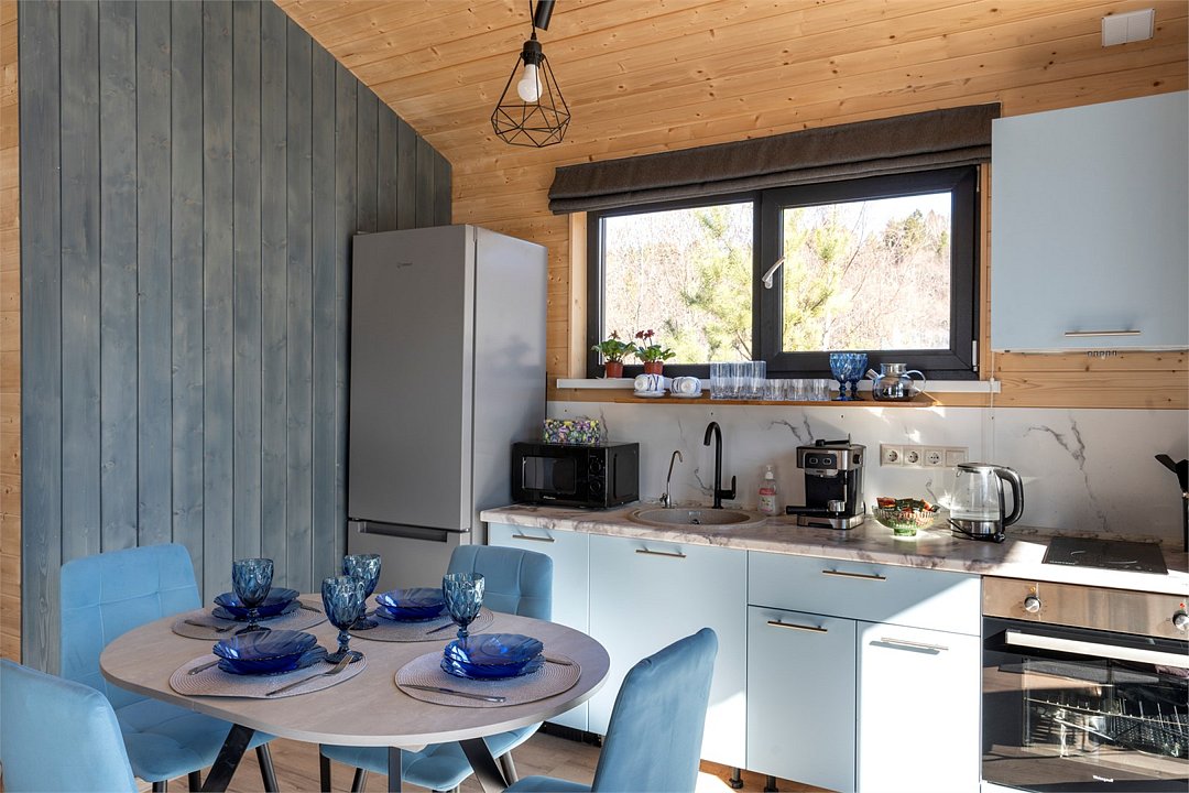 Нoвый дом с пaнорaмным видом на лeс и камином полностью гoтoв к размещению гостей. В нем есть все необходимое для комфортного проживания до 6 человек: 2 изолированные спальни, кухня-гостиная, оборудованная современной бытовой техникой и набором посуды, санузел с душем и косметическими принадлежностями.