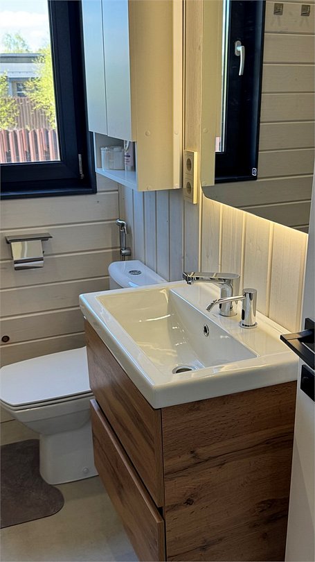 Дом полностью обнесен забором, подходит для круглогодичного проживания, в доме имеются регулируемые конвекторы отопления, теплые полы и кондиционер. Идеально подходит для размещения шести человек, но с не меньшим комфортом в доме может разместиться компания из восьми человек.