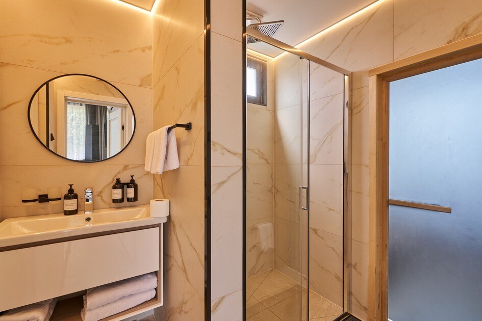 Уютный дом для пары или небольшой семьи, оснащенный сауной и открытым бассейном с горячей водой. Расположенный среди лесного массива, он окружен тишиной и спокойствием. По соседству находится еще один стильный дом, что способствует созданию атмосферы уединения и комфорта.