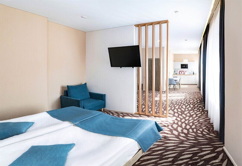 Номер Апартаменты — просторный однокомнатный номер с двумя раздельными кроватями, оборудованный по последнему слову техники с собственной кухней. Современный дизайн интерьера выполнен в актуальной палитре цветов. Номер идеально подходит для семейного отдыха с детьми или друзьями.