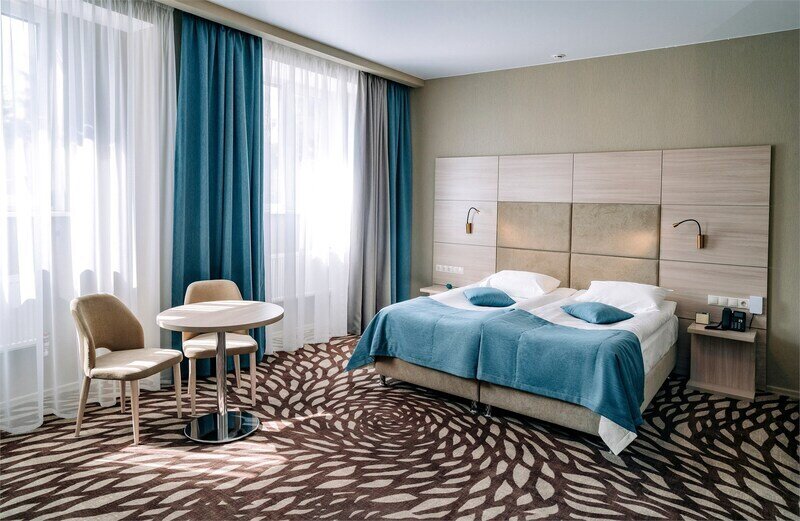 Номер Джуниор — просторный двухместный номер с двумя односпальными кроватями. Интерьер выполнен в современном стиле и гармоничной цветовой гамме. Номер идеально подходит для семейного отдыха с детьми.