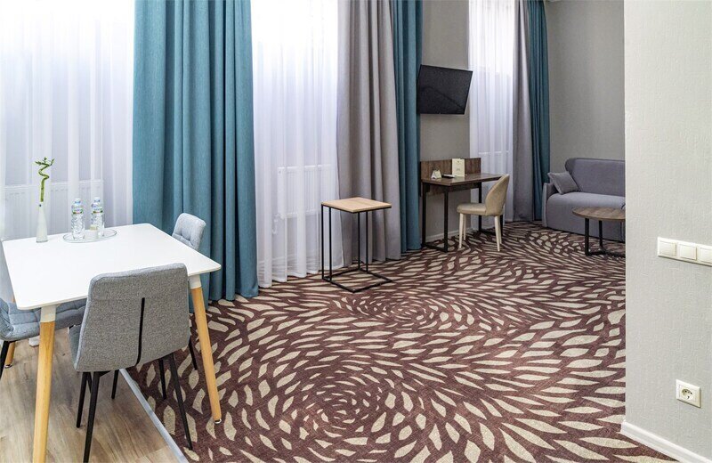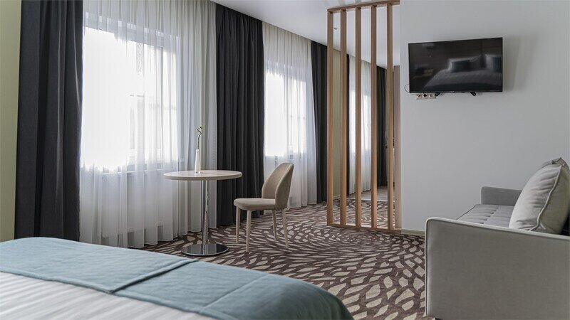 Номер Джуниор — просторный двухместный номер с двуспальной кроватью. Интерьер выполнен в современном стиле и гармоничной цветовой гамме. Номер идеально подходит для семейного отдыха с детьми.