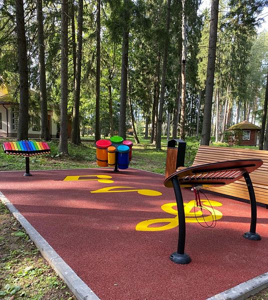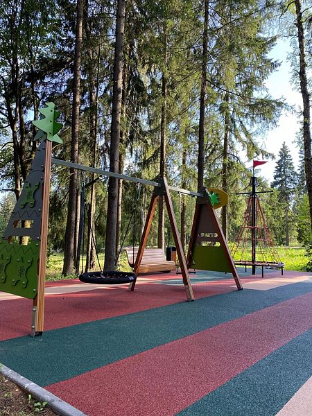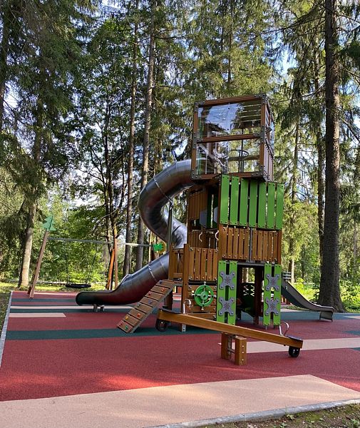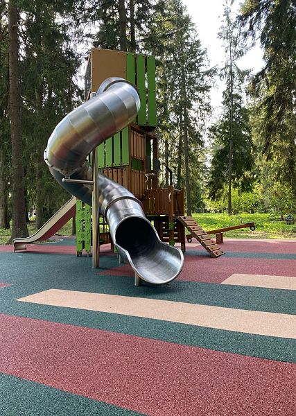 Детская площадка оборудована качелями, горками и лабиринтами, что позволяет детям не только играть, но и развиваться физически, а мягкое покрытие создает дополнительную защиту.