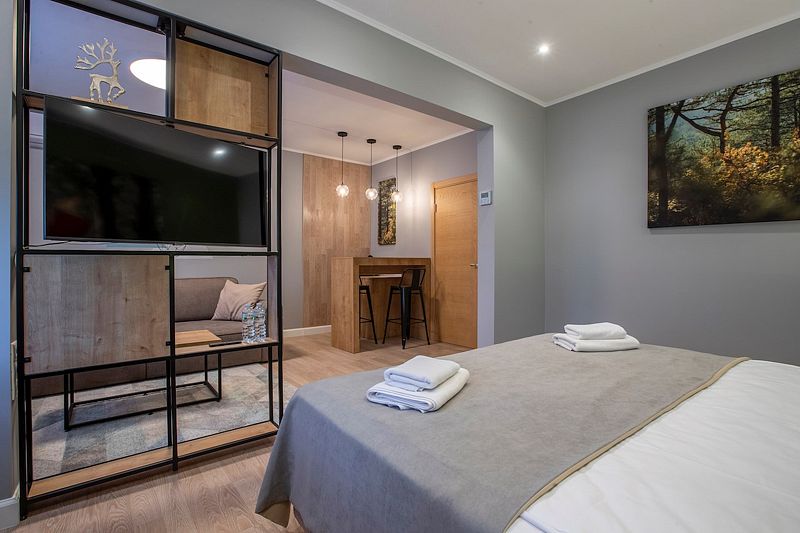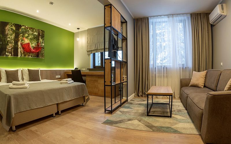 В номере данной категории предлагается на выбор одна двуспальная кровать или две односпальные кровати и двуспальный диван. Гигиенический душ, шапочка для душа.