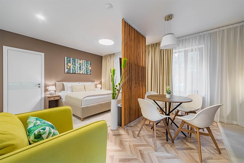Семейный отдыхДостоинстваМы всем довольны) Нам достался прекрасный номер: современный, уютный, с красивым интерьером. Удобная кровать с качественным постельным бельем, несколько столешниц для работы или перекуса, шторы блэкаут для крепкого сна, удобный диван, мягкие халаты, теплый пол в ванной, а за окном -красивейший лес. Завтраки, хотя и без изысков, были разнообразными и вкусными. Дети были в восторге от новой детской площадки на улице. Территория, вся в высоких деревьях и соснах, вокруг спокойно и комфортно. Парковка у корпуса была удобной, возможность спуститься к реке - огромный плюс.