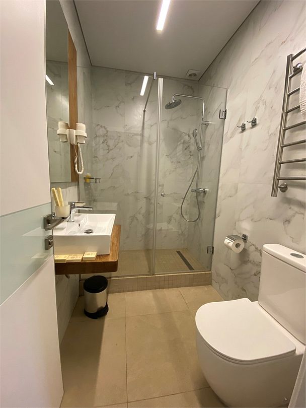 Морозильная камера, светильник, гигиенический душ, шапочка для душа, косметические средства, санузел на этаже.