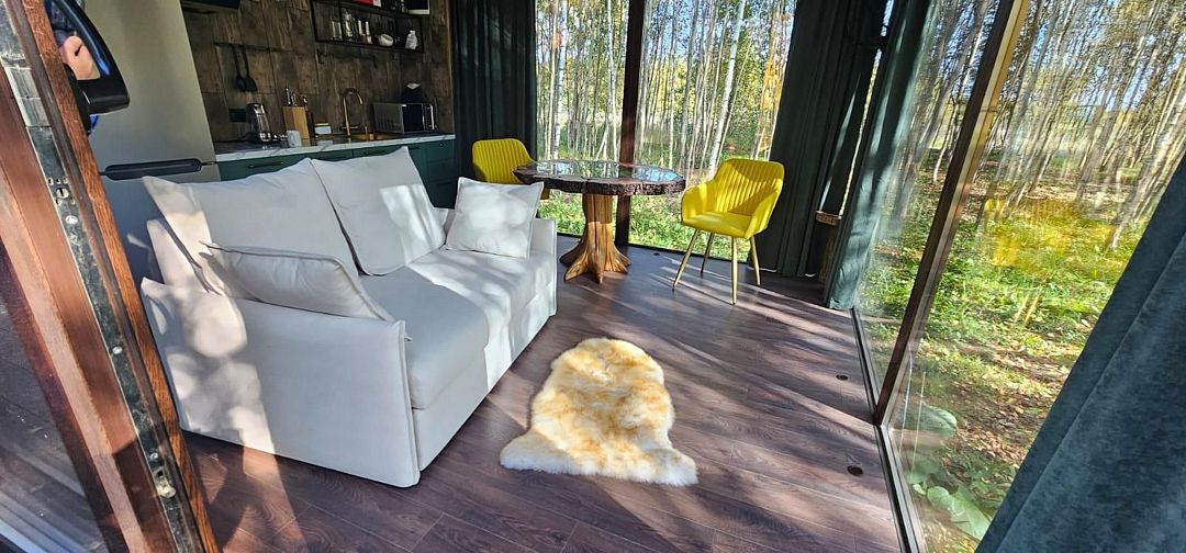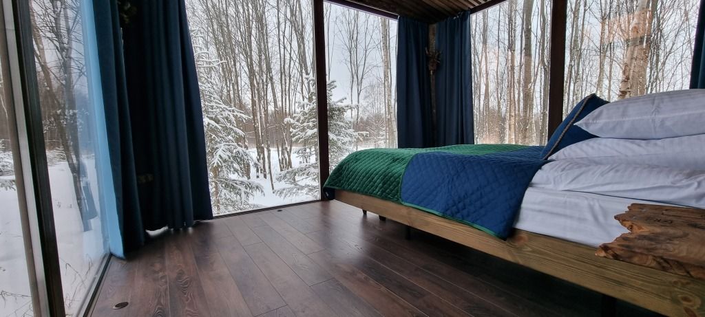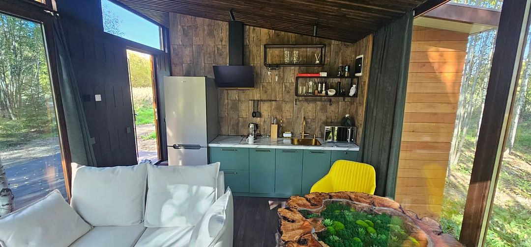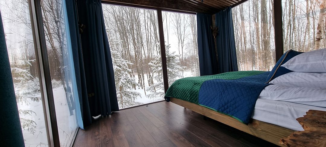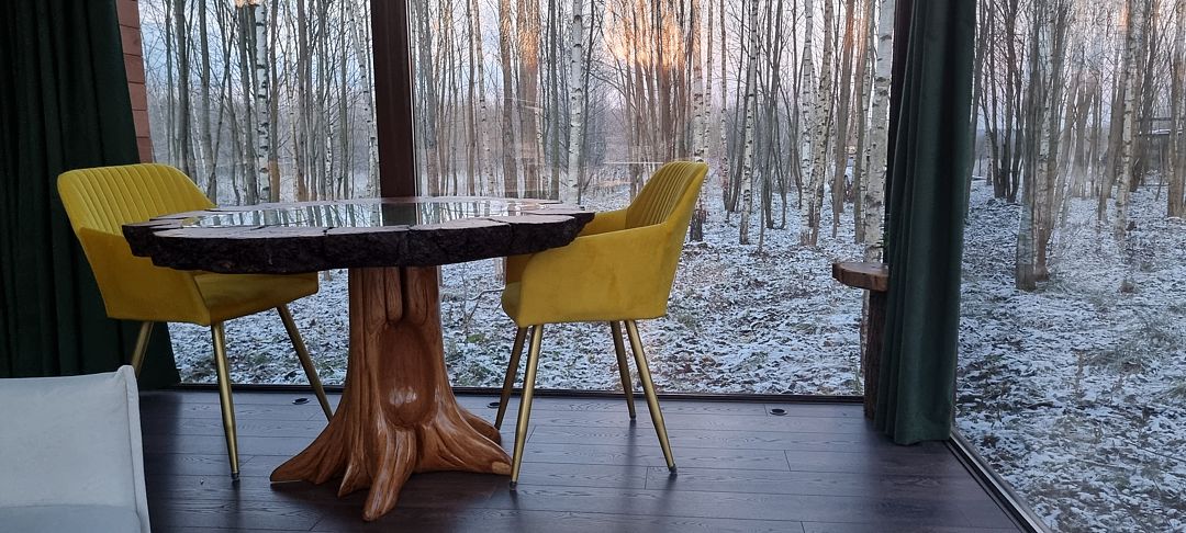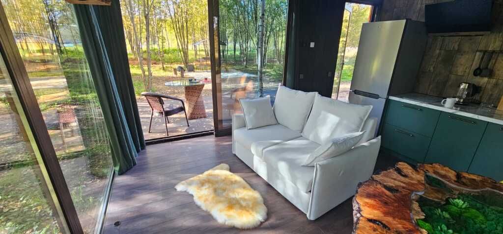 Потрясающий панорамный вид на лес и реку Лесминка создает ощущение уединения и связи с природой. Это идеальное место для тех, кто ищет уютный отпуск с близкими, наслаждаясь временем, проведенным вместе за настольными играми.