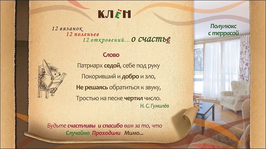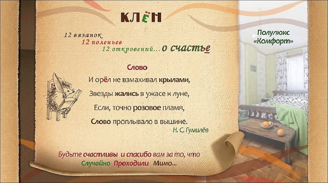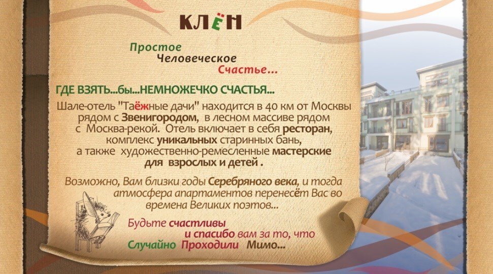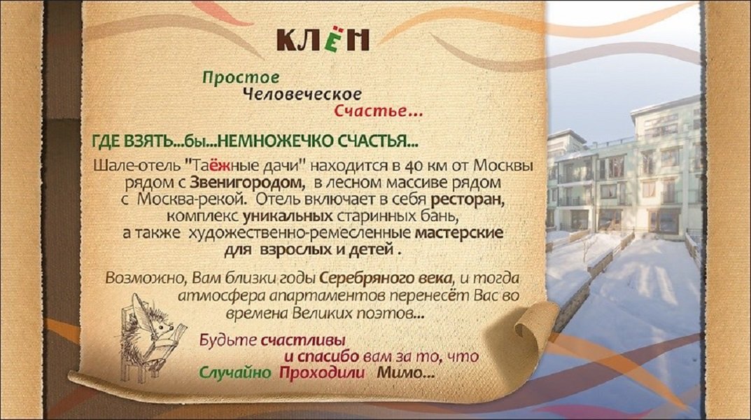 Бутик-отель Клен находится под Звенигородом и входит в состав загородной Резиденции рядом с Москвой-рекой, всего в 40 км от Москвы. Поблизости находятся Саввино-Сторожевский монастырь, Главное здание МГУ. Отель перенесет вас в атмосферу Серебряного века, во времена великих поэтов.