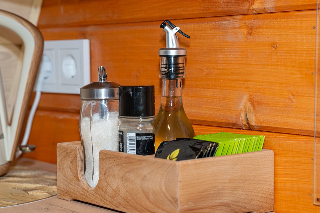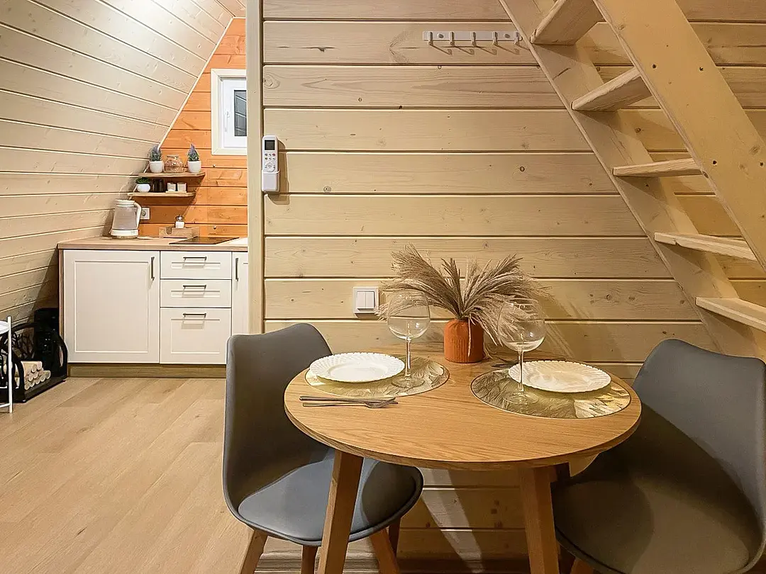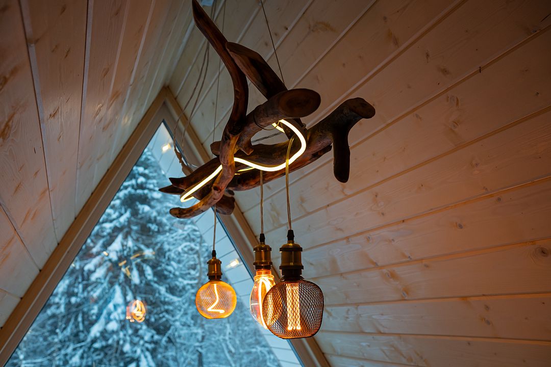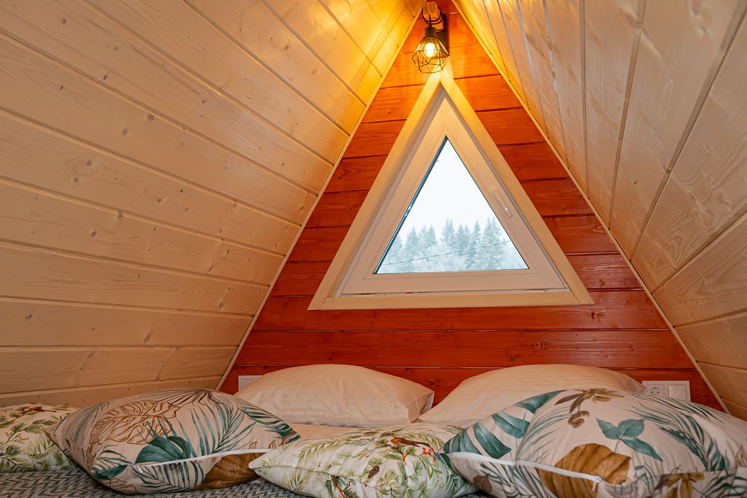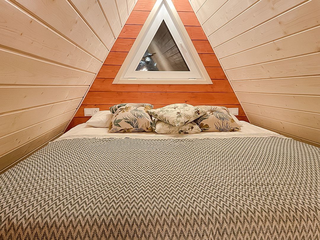 А-фрейм рассчитан на 4 человека. На втором этаже расположена двуспальная кровать. На первом этаже раскладной диван на двоих, обеденный стол со стульями, кухня, с/у с душем и терраса с видом на дикий лес с шезлонгами и горячей купелью (необходимо заказывать отдельно).