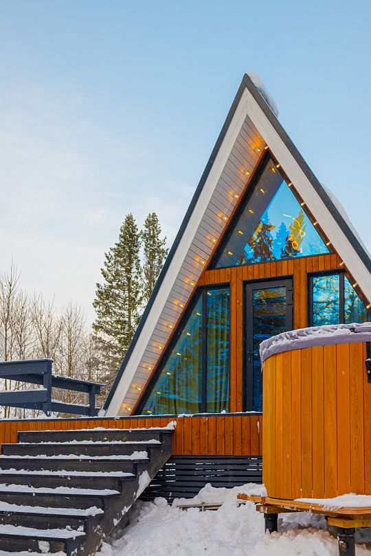 Семейный отдыхДостоинстваОтличный отпуск для всей семьи! Уютный треугольный домик. Восхитительное сочетание природы и удобств цивилизации. Дом выполнен в скандинавском стиле. Из окна вид на лес. В доме было все необходимое для комфортного проживания, включая подогреваемые полы и обогреватели в холодное время года. Комната также оснащена полотенцами, шампунем, кондиционером и гелем для душа. На территории домика есть горячая купель.