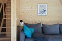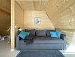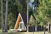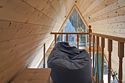 К размещению гостей предлагается уютный домик А-фрейм, вместимостью на 2 человека. Площадь 40 квадратных метров. На 2 этаже расположена двуспальная кровать King Size, на первом — раскладной диван. Самостоятельная организация питания возможна на полностью оборудованный кухне. Для этого есть мини-холодильник, электрическая плита, электрический чайник и полный набор посуды. Уютный дом-шалаш оснащен баней с купелью и проектором для просмотра любимых фильмов.