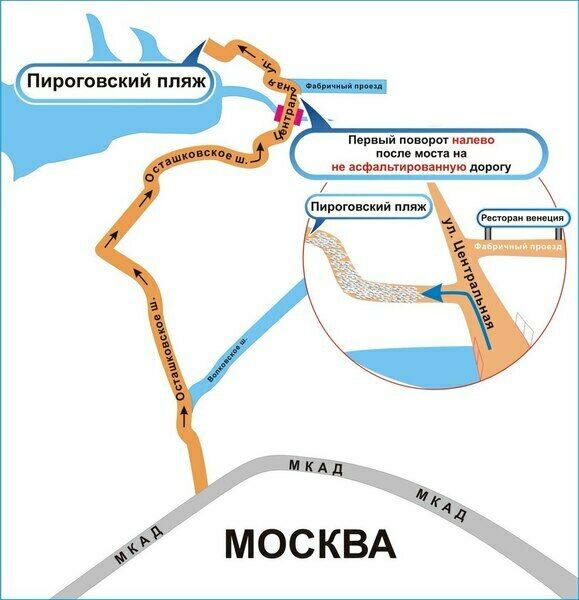 Вариант проезда: Из Москвы по Осташковскому шоссе,через 4 км напротив ДПС указатель "направо Мытищи,налево Пушкино, Пирогово". Нам налево. Проехать Бородино, Беляниново. На указателе "налево Поведники,Дмитриевское ш., направа Пирогово, Жостово" повернуть направо. Проехать Болтино, Пирогово. На светофоре суказателем "направо Мытищи, прямо Жостово" проехать прямо. Через 200м после моста через Клязьму, перед рекламным щитом ресторана "Венеция" - указатель -"Пляжный Волейбол" и грунтовая дорога налево. По ней 700м до шлагбаума. Общая длина пути - примерно 14 км от МКАД. Так же можно заезжать через Дмитровское шоссе (20 км), Осташковское-Пироговское шоссе (14км), Ярославское шоссе-Мытищи-Пироговоское шоссе(14 км).