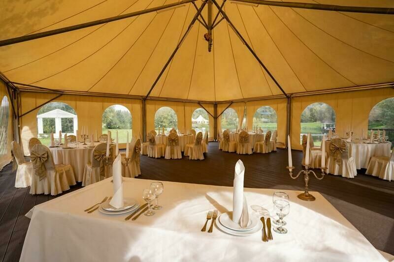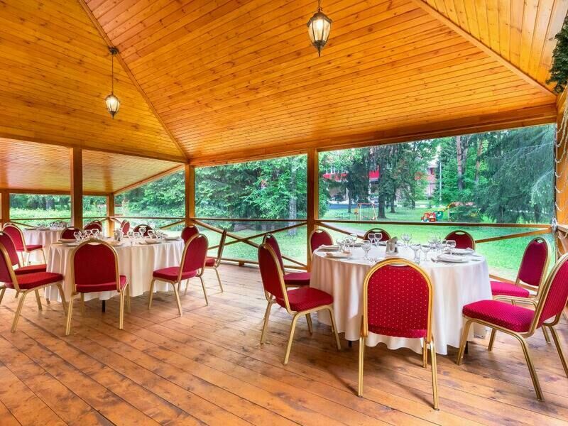 - Зал ресторана с террасой. Вместимость: до 400 человек. Можно устроить торжественные приемы, корпоративные вечеринки, юбилеи, свадьбы, а также бизнес–ланчи и ужины для участников мероприятий.