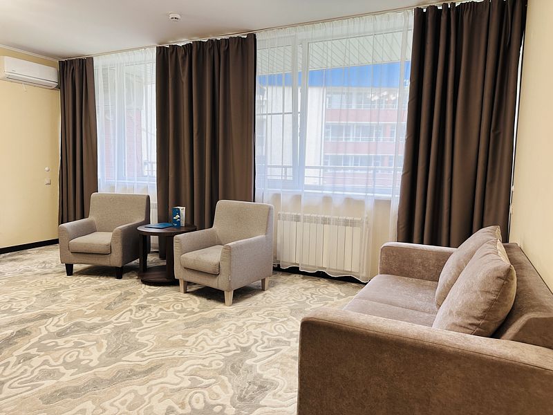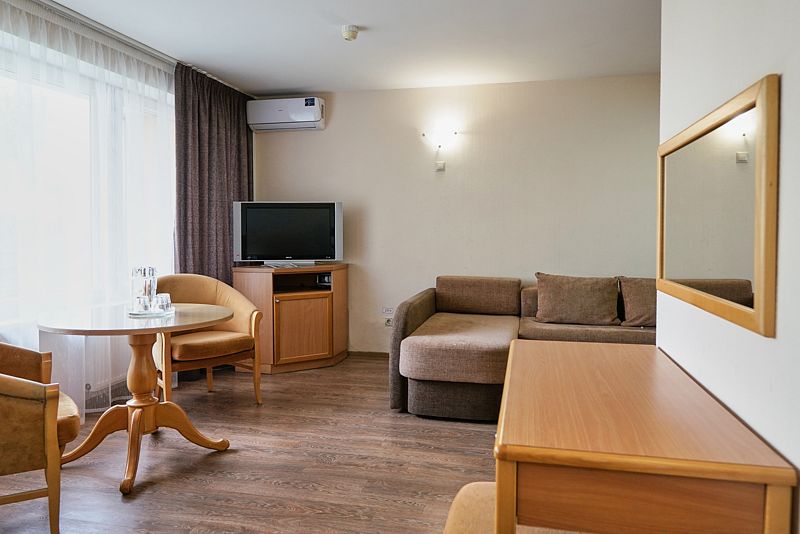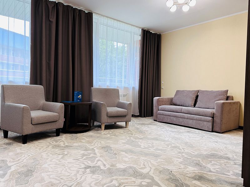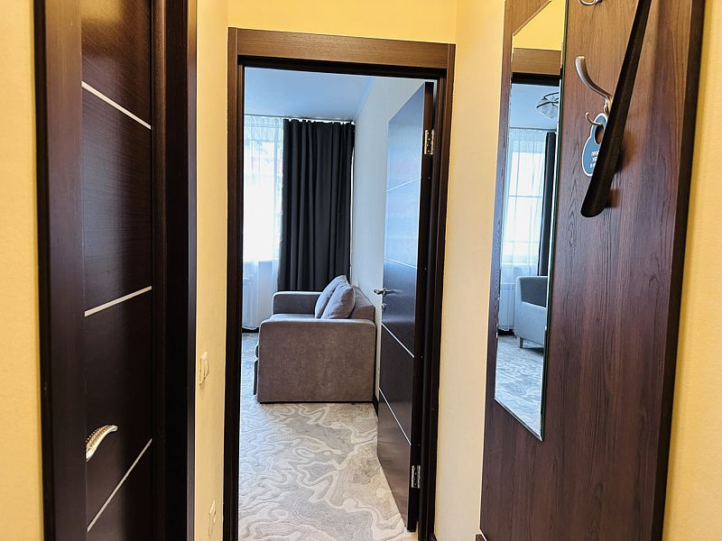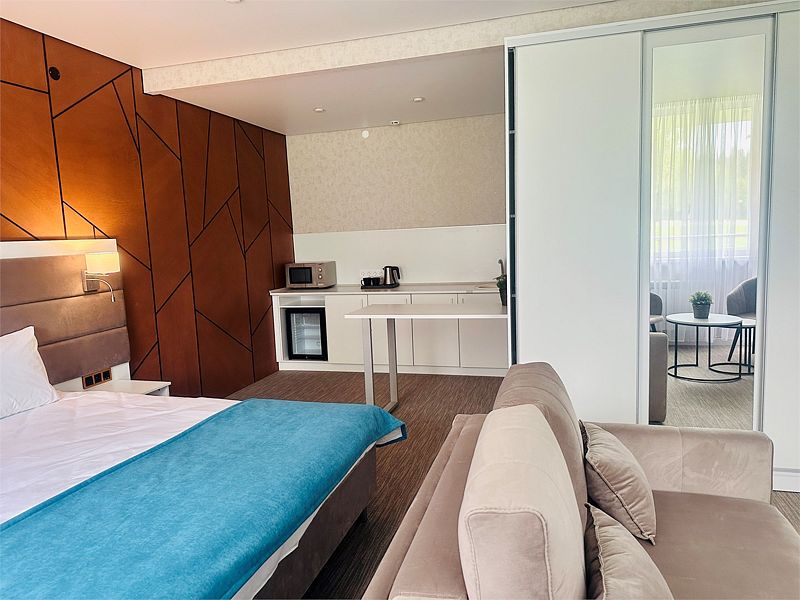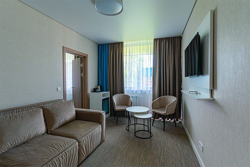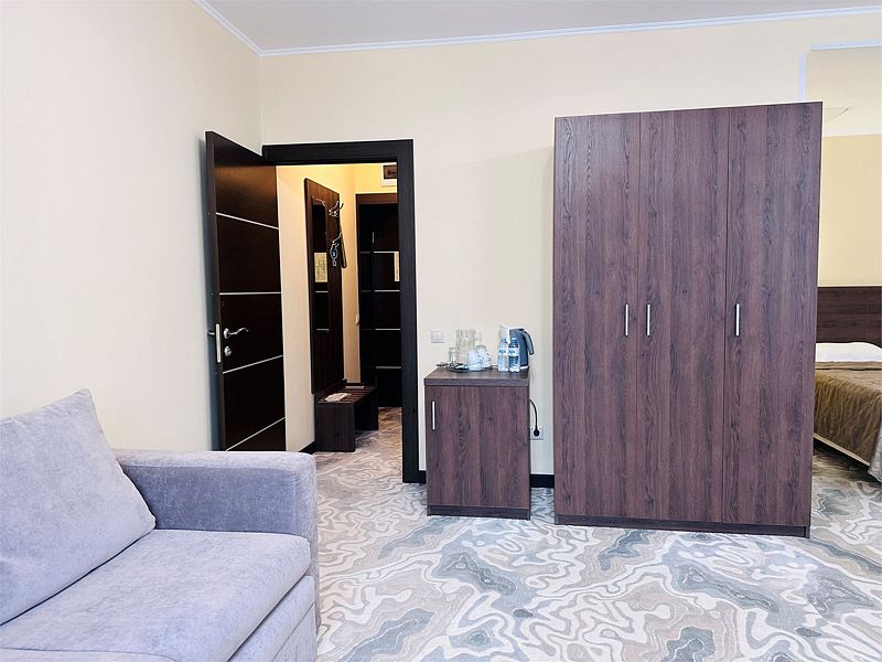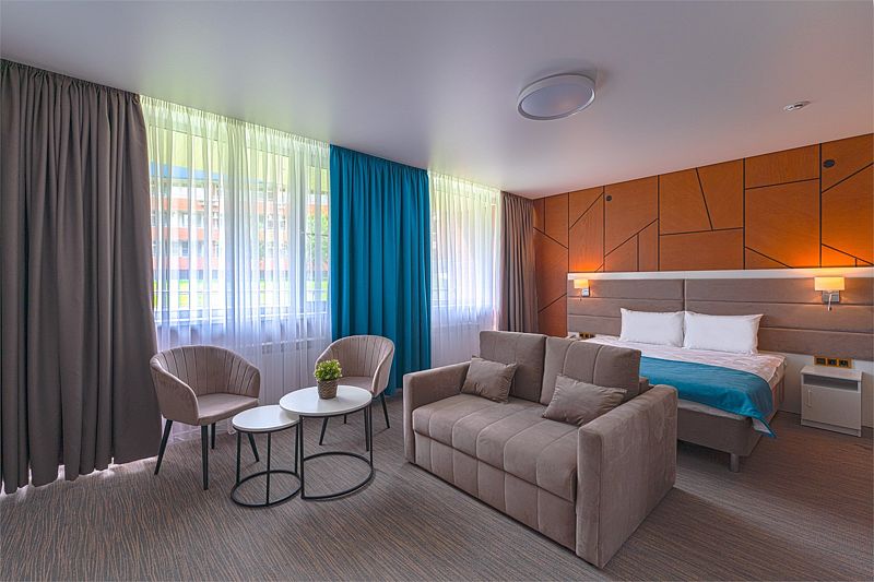 Новый номер после капитального ремонта корпуса. Современный, стильный и лаконичный дизайн создает атмосферу спокойствия и уюта, чтобы у вас остались самые приятные воспоминания о пребывании у нас. Самая популярная категория номера для семейного отдыха с детьми. В номере есть удобный раскладной диван.