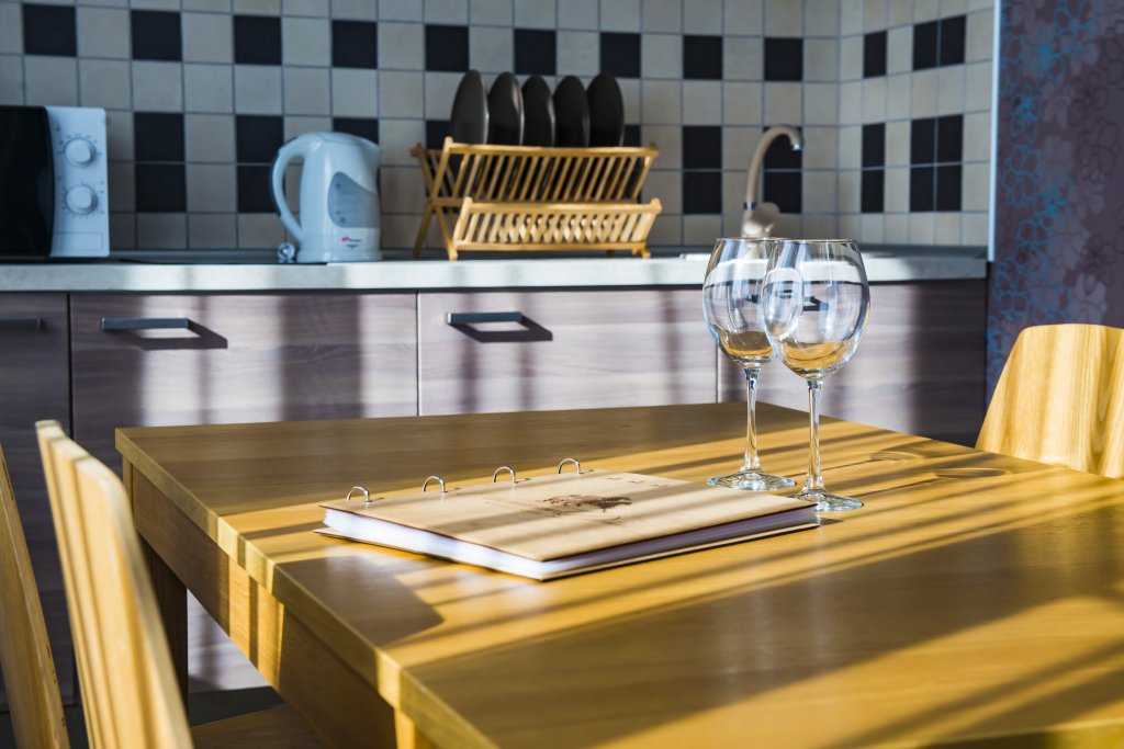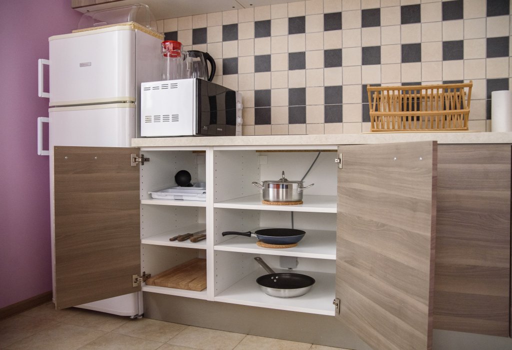 • кухонный уголок оборудованный плитой, СВЧ и набором столовой и кухонной посудой;