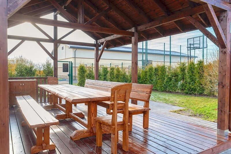 Летом гости могут разместиться на открытой шикарной веранде, полюбоваться зеленью сада, цветами на клумбах.