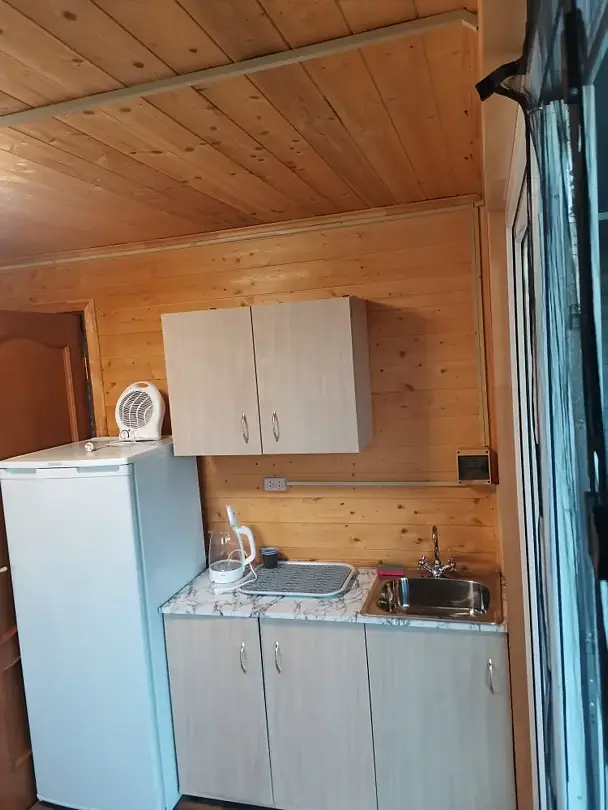 В спальне двуспальная кровать, на кухне раскладной диван. Душ, туалет в доме. Чайник, эл. плита, микроволновая печь в доме.
