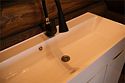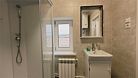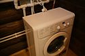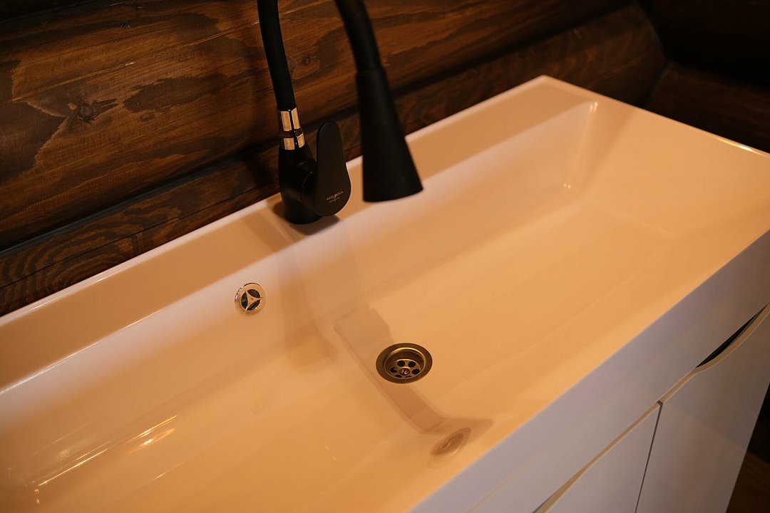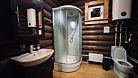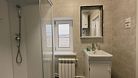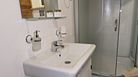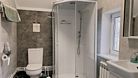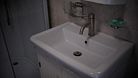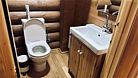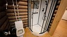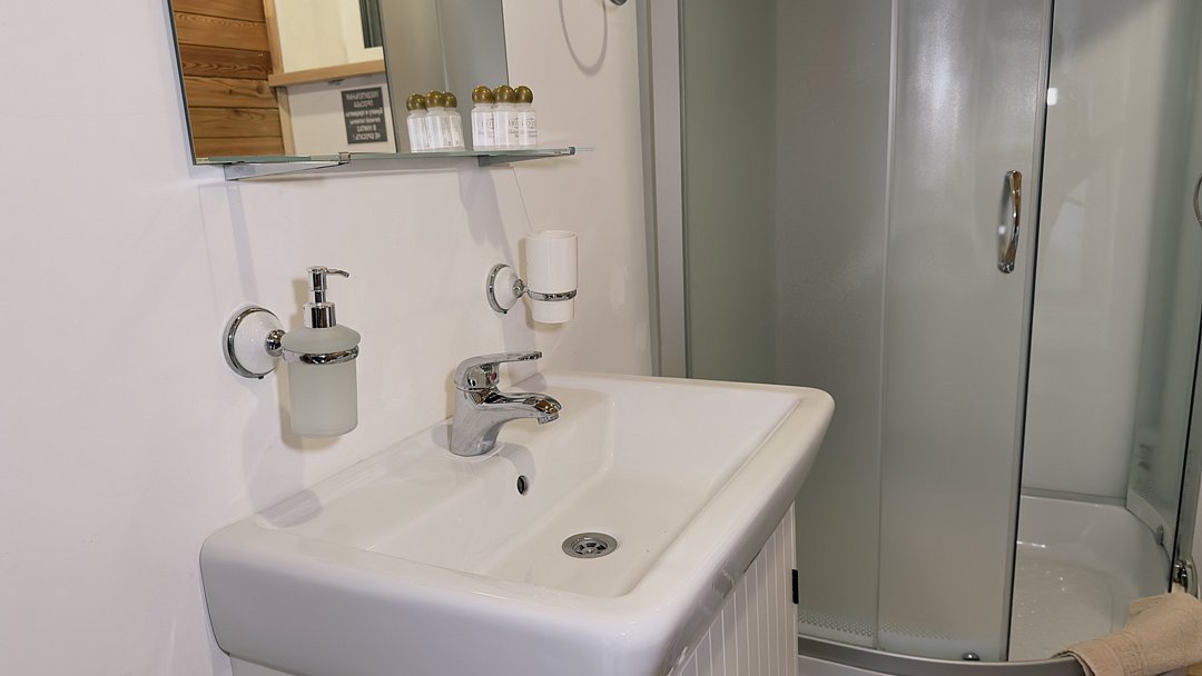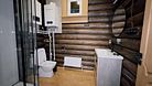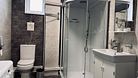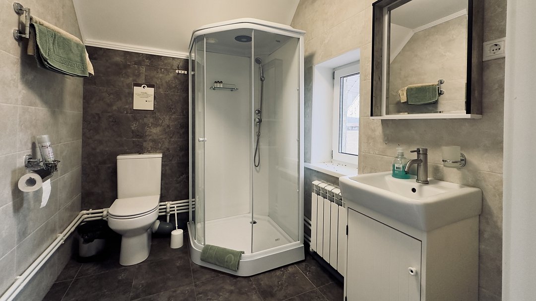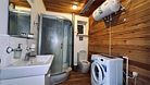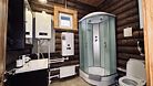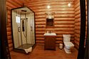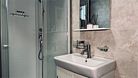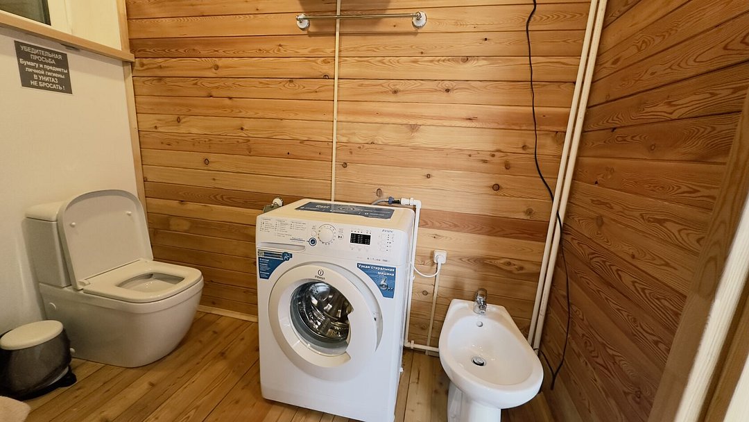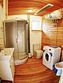 - Санузел с душевой кабиной, стиральной машиной, умывальником с тумбой и феном.