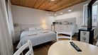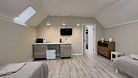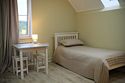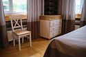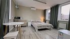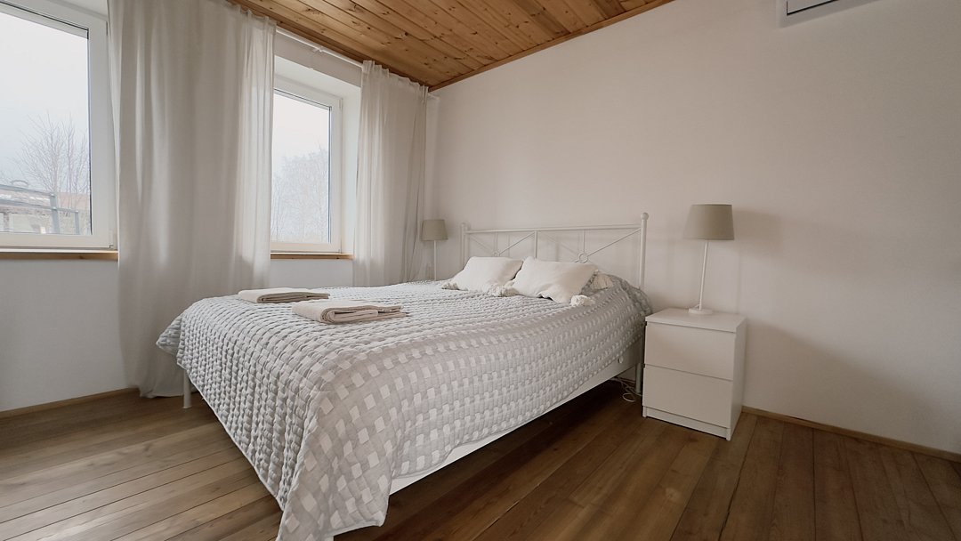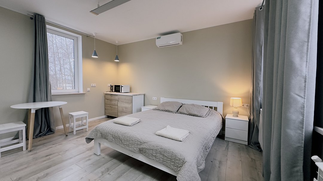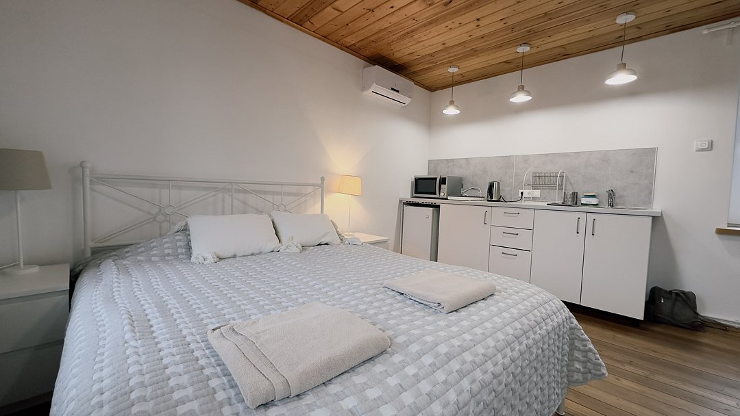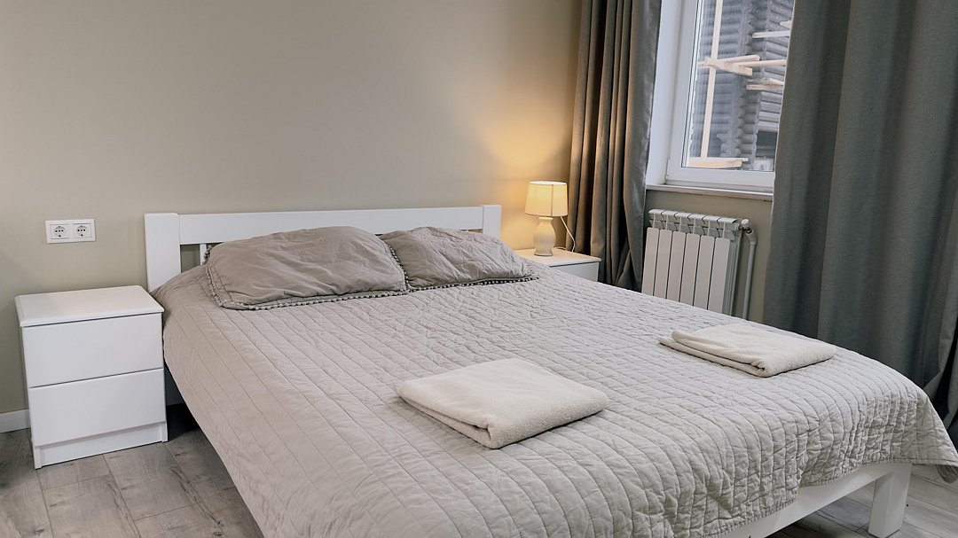 Уютные апартаменты площадью 30 м² на первом этаже дома с отдельным входом идеально подойдут для романтической поездки или спокойного семейного отдыха. Светлая комната с двуспальной кроватью, удобными прикроватными тумбами и мягким светом настольных ламп создаёт атмосферу домашнего уюта.