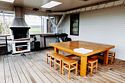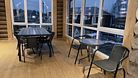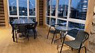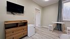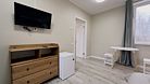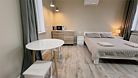 - Полностью оборудованная кухня: холодильник, микроволновка, электрочайник, комплект посуды и приборов, обеденный стол и табуретки.