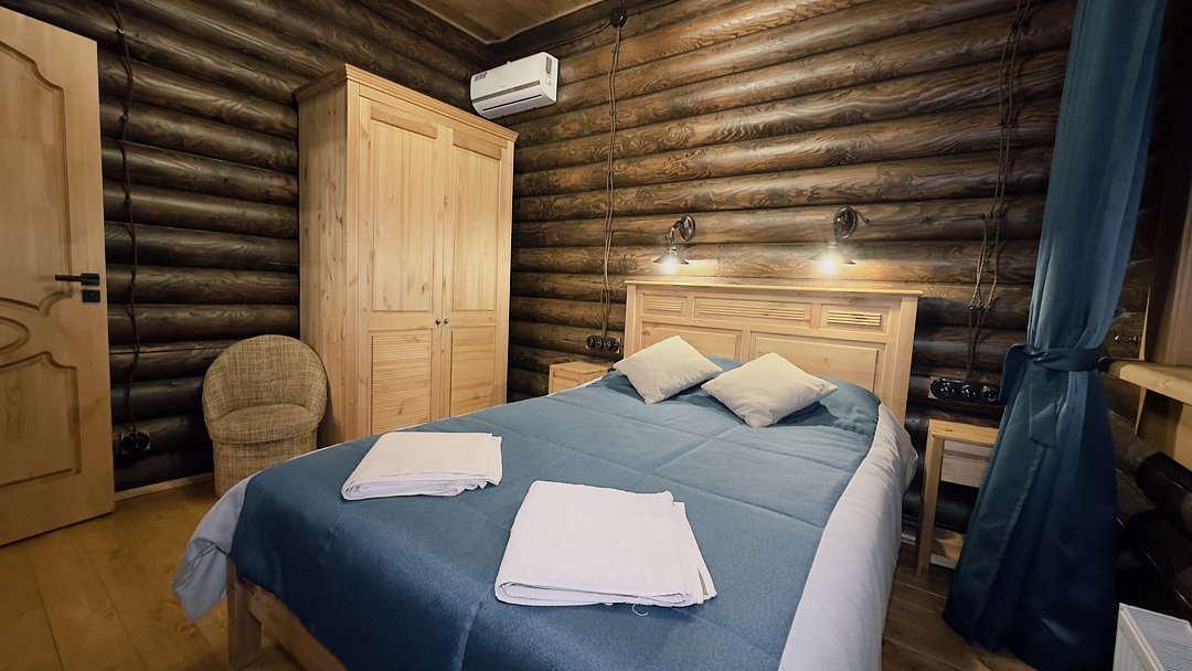 - Комната с двуспальной кроватью, телевизором и кондиционером.