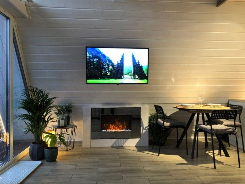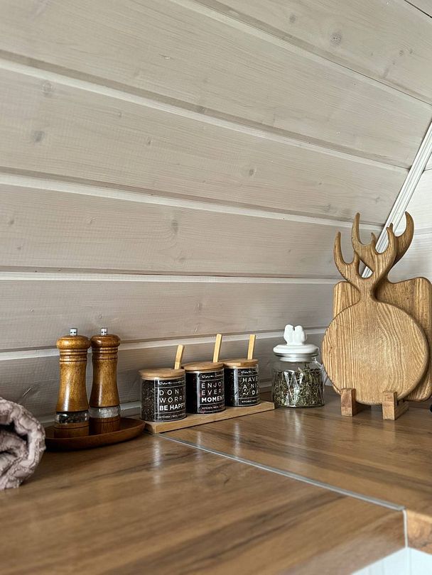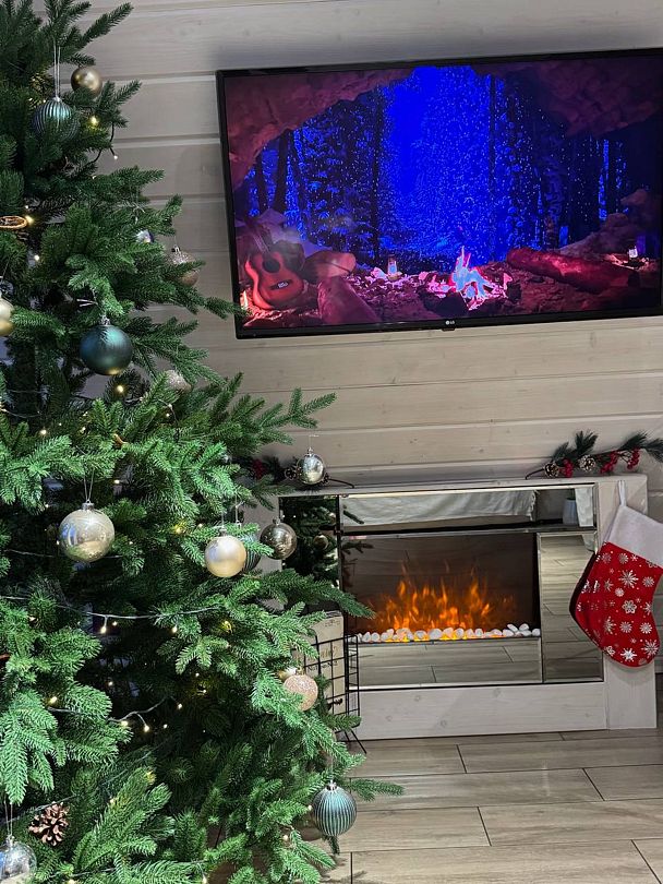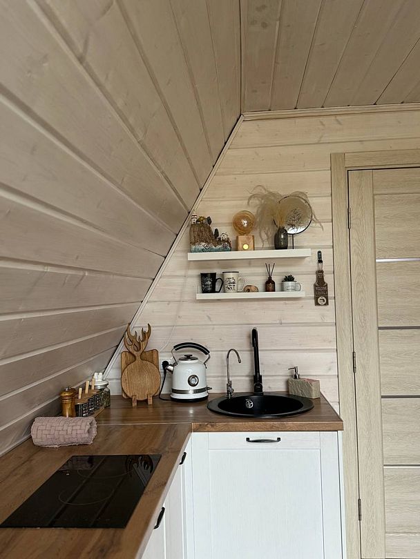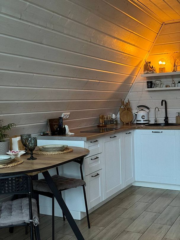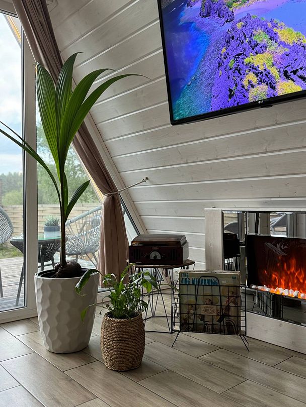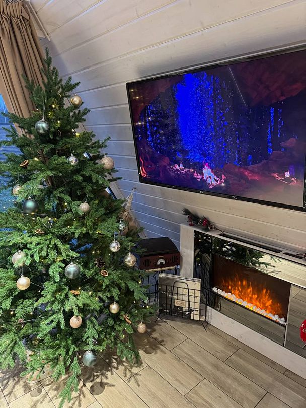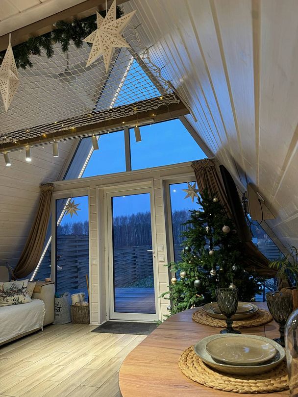 В доме гостиная с электрическим камином, сетка-гамак, полностью оснащённая кухня, питьевая вода, телевизор (Smart TV), колонка с Алисой. Есть проигрыватель виниловых пластинок, настольные игры, Wi-Fi. В доме 4 спальных места (на втором этаже двуспальная кровать Double king size 2х2м, на первом этаже раскладной двуспальный диван), комфортный санузел внутри дома.
