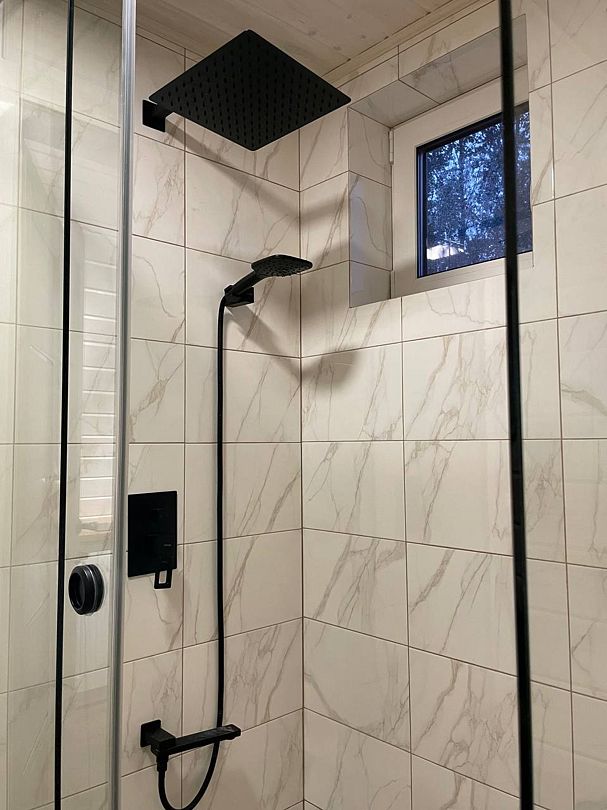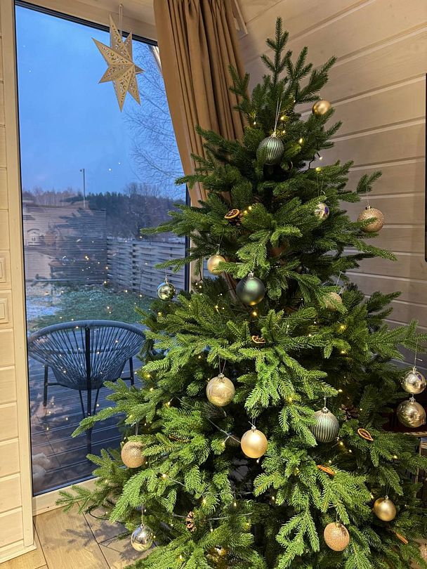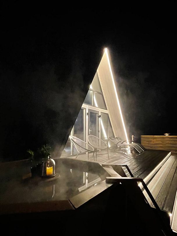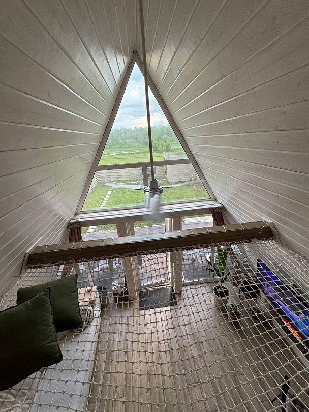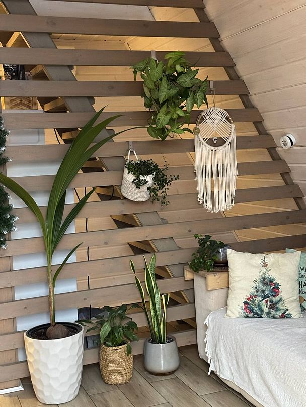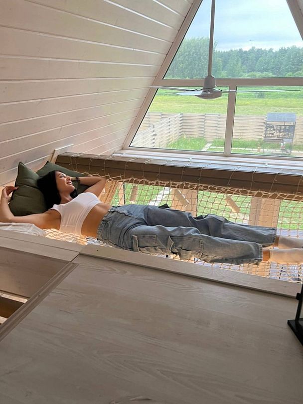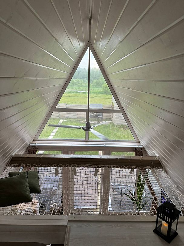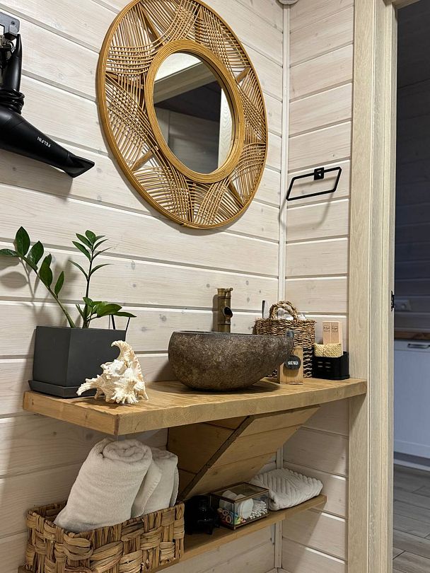 В доме гостиная с электрическим камином, сетка-гамак, полностью оснащённая кухня, питьевая вода, телевизор (Smart TV), колонка с Алисой. Есть проигрыватель виниловых пластинок, настольные игры, Wi-Fi. В доме 4 спальных места (на втором этаже двуспальная кровать Double king size 2х2м, на первом этаже раскладной двуспальный диван), комфортный санузел внутри дома.