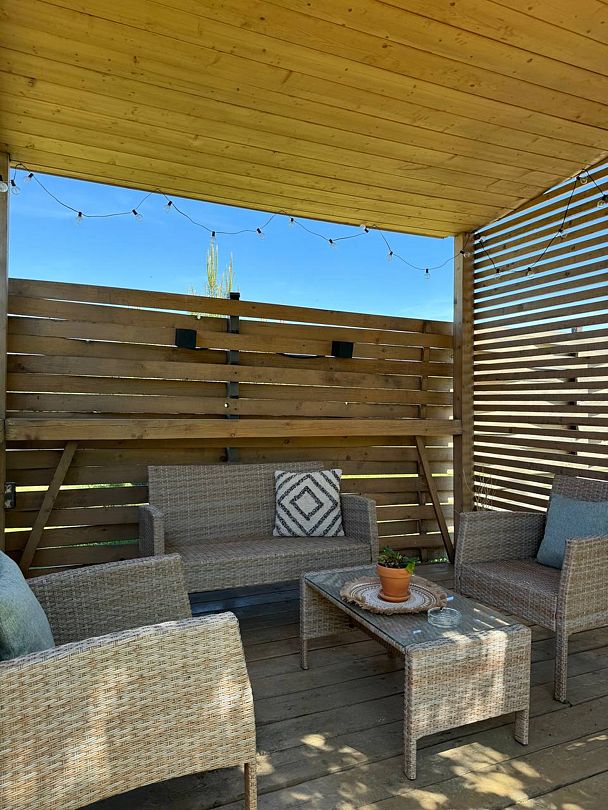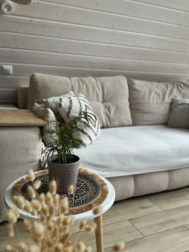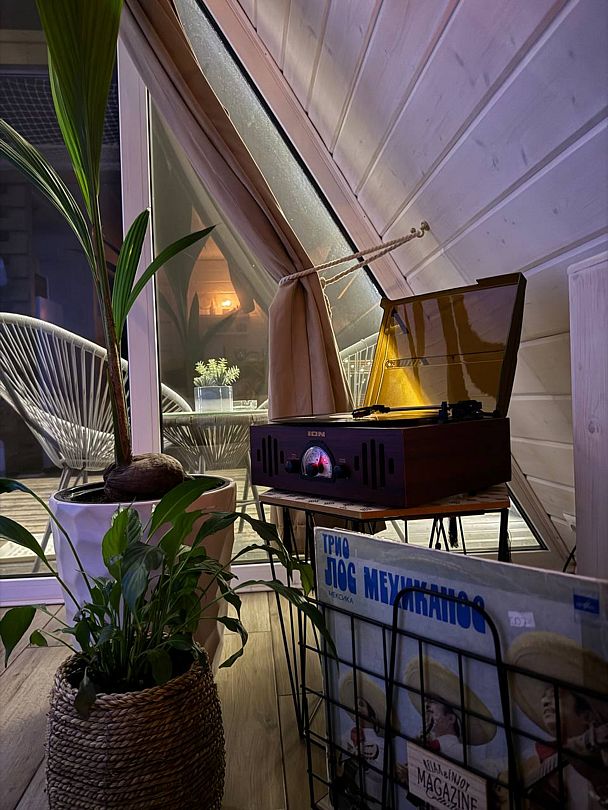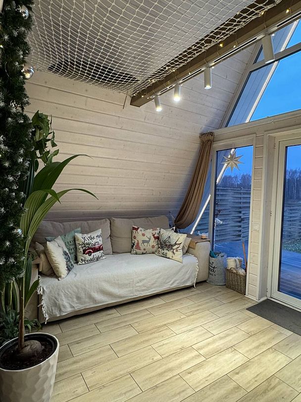 Дом порадует Вас просторной гостиной с очаровательным электрическим камином и подвесным гамаком. Полностью оборудованная кухня обеспечит все необходимое для приготовления блюд, а Smart TV, умная колонка Алиса и проигрыватель виниловых пластинок позаботятся о развлечениях. Настольные игры, Wi-Fi и комфортный санузел дополнят Ваши удобства.