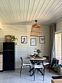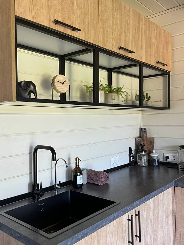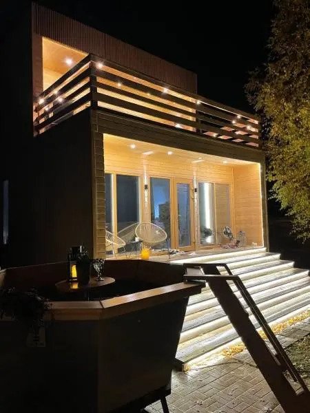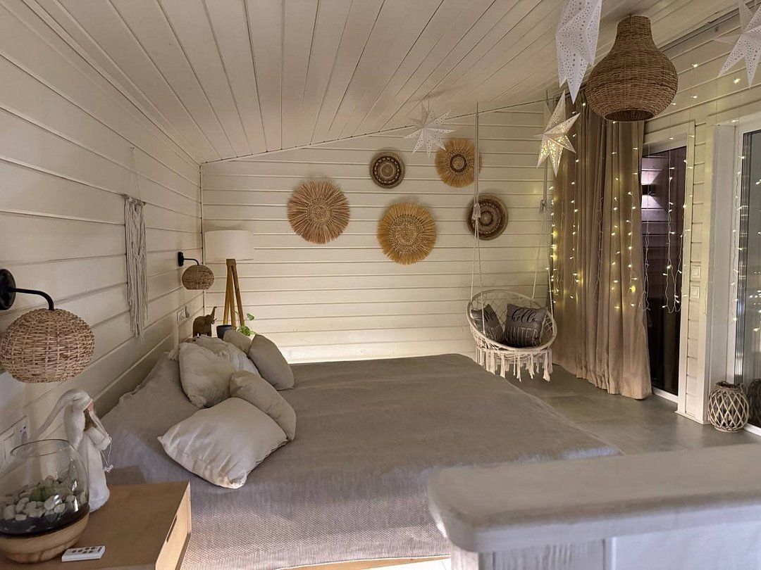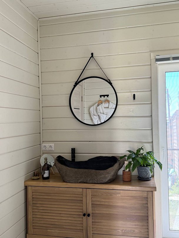 В доме большая спальня с подвесными креслом-гамаком и панорамным видом на реку, терраса с садовой мебелью, гостиная с электрическим камином, полностью оснащённая кухня, питьевая вода, телевизор (Smart TV), колонка с Алисой, настольные игры, Wi-Fi. В доме 4 спальных места (на втором этаже двуспальная кровать Double king size 2х2м, на первом этаже раскладной двуспальный диван), комфортный санузел внутри дома.