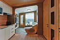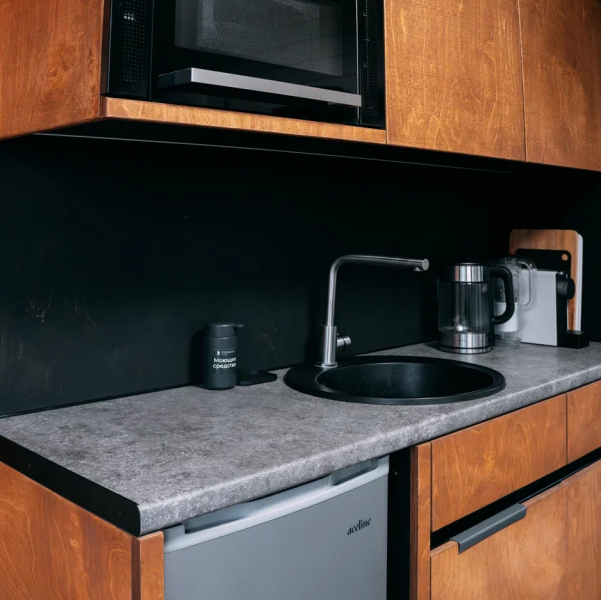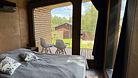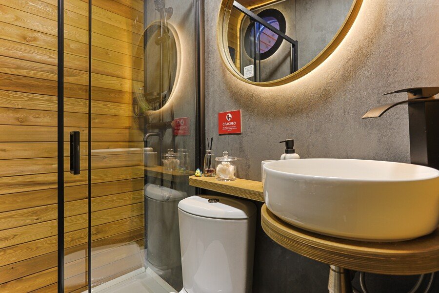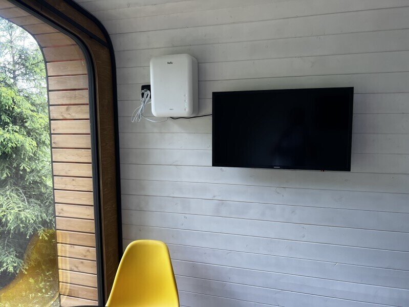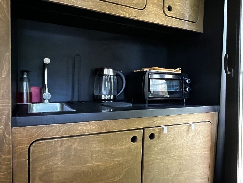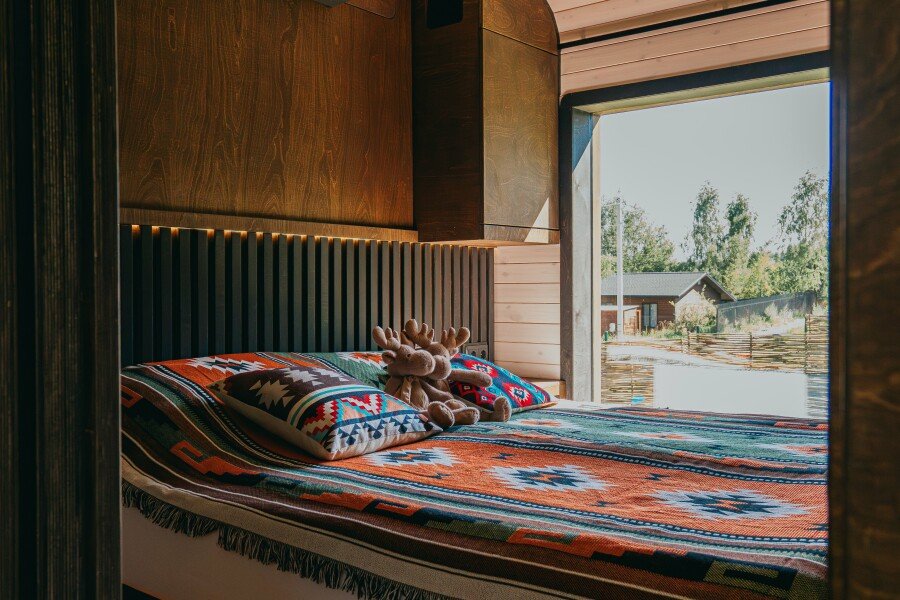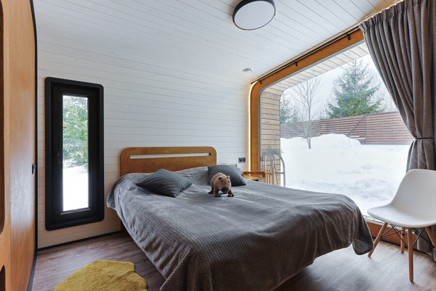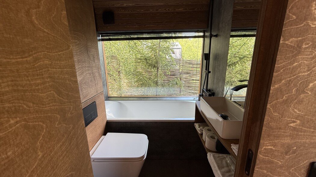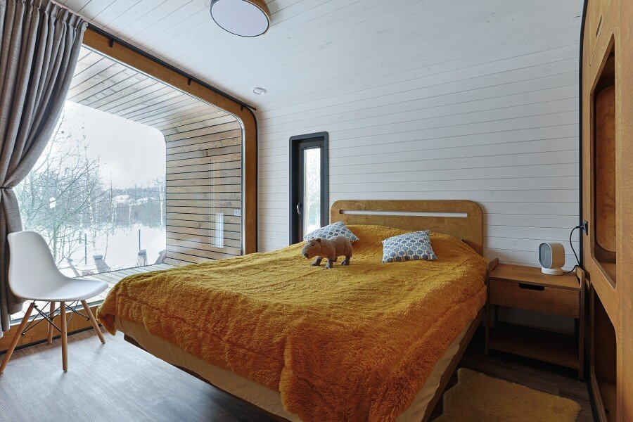 Внутри: гостиная с диваном и панорамным видом на лес. ЖК‑телевизор 55" с оплаченным Кинопоиском. Кухня оборудована индукционной плитой, холодильником с морозильной камерой, посудомоечной машиной, микроволновой печью, чайником, кофемашиной и всей необходимой посудой. Кондиционеры. Санузел с душем, комплект полотенец для каждого гостя и фен. Раскладная детская кроватка. Большая веранда с пуфиками. Высокоскоростной интернет (Wi‑Fi).