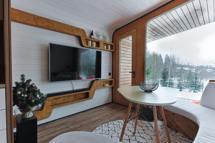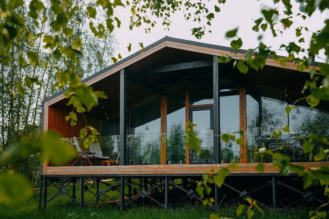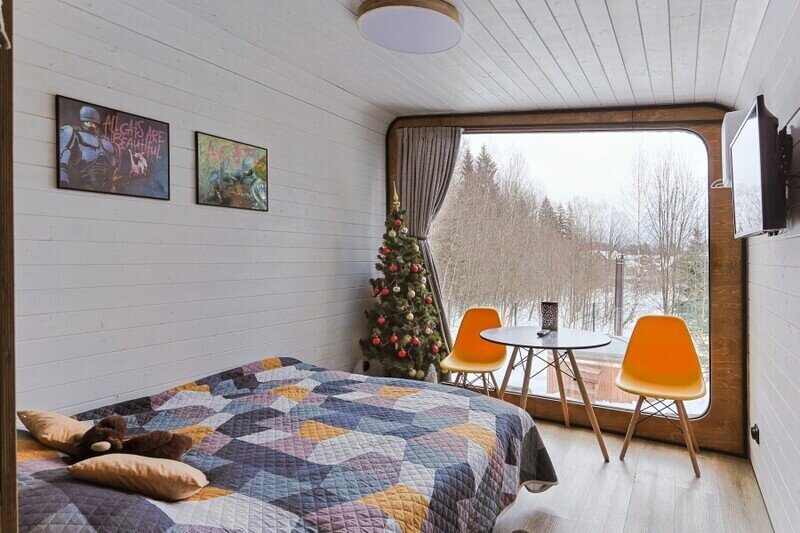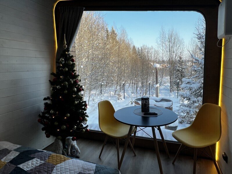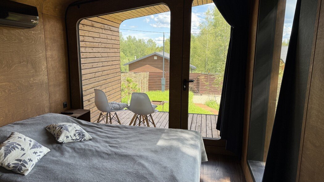 Внутри: гостиная зона с панорамным окном, веранда с мебелью, кухня, оборудованная холодильником с морозильной камерой, микроволновой печью, чайником, кофемашиной и всей необходимой посудой, санузел с ванной и окном, комплект полотенец для каждого гостя, фен, высокоскоростной интернет (Wi-Fi), кондиционер, Яндекс Станция.