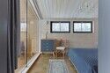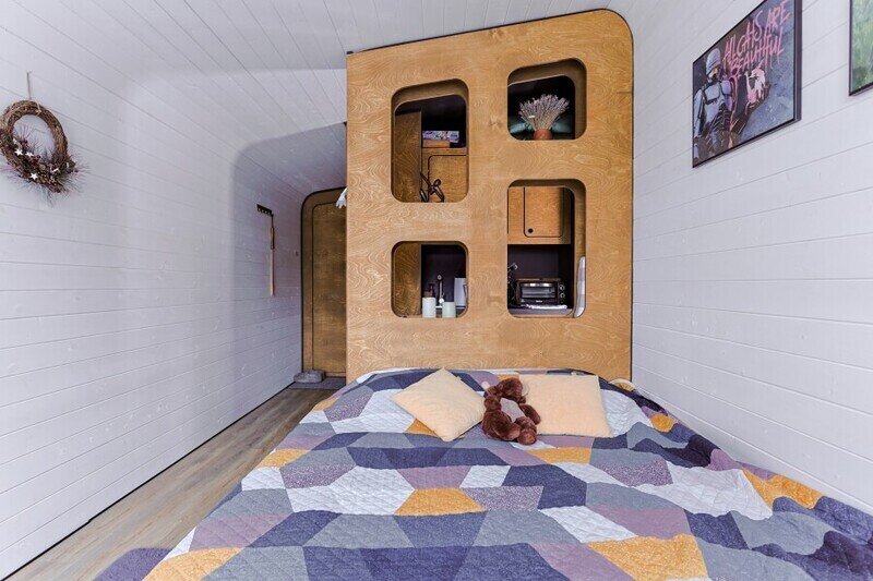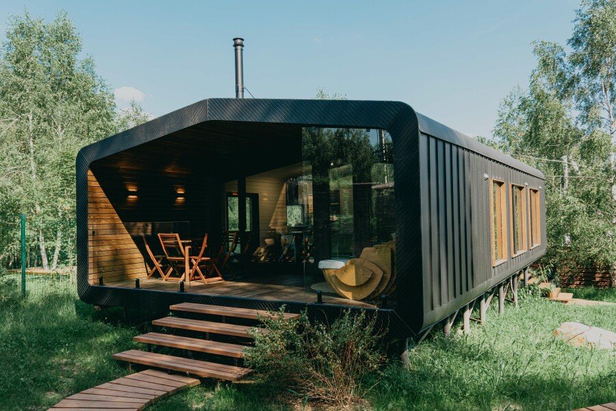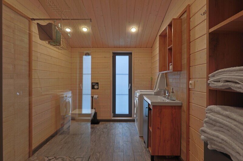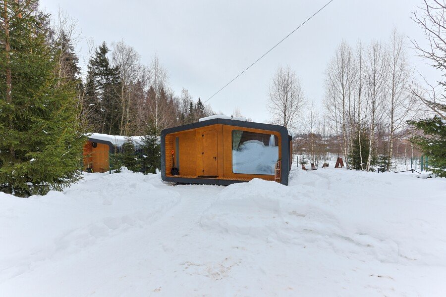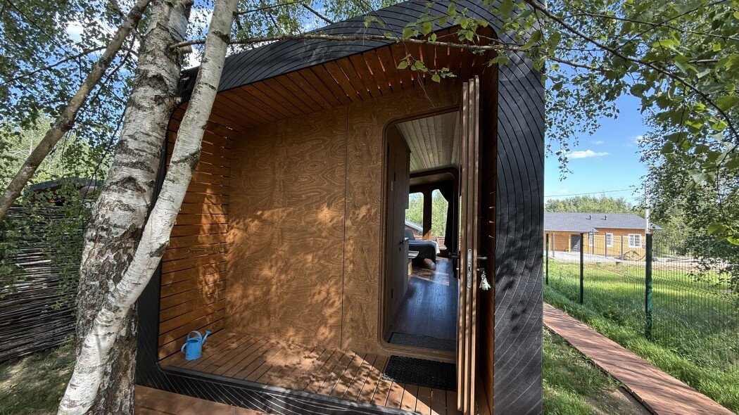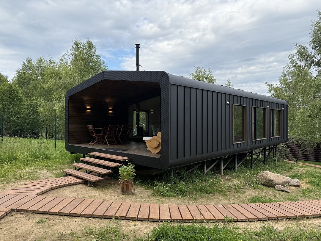 Внутри: гостиная зона с панорамным окном, веранда с мебелью, кухня, оборудованная холодильником с морозильной камерой, микроволновой печью, чайником, кофемашиной и всей необходимой посудой, санузел с ванной и окном, комплект полотенец для каждого гостя, фен, высокоскоростной интернет (Wi-Fi), кондиционер, Яндекс Станция.