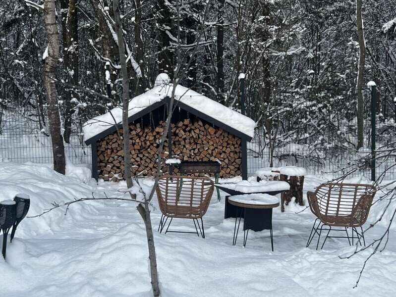 На участке: баня с панорамными окнами и дровяной печью, кострище и мангал для барбекю, шампуры и решётка для гриля, дрова для камина и кострища — бесплатно, садовая мебель (кресла, шезлонги), бесплатная парковка для двух авто на участке.
